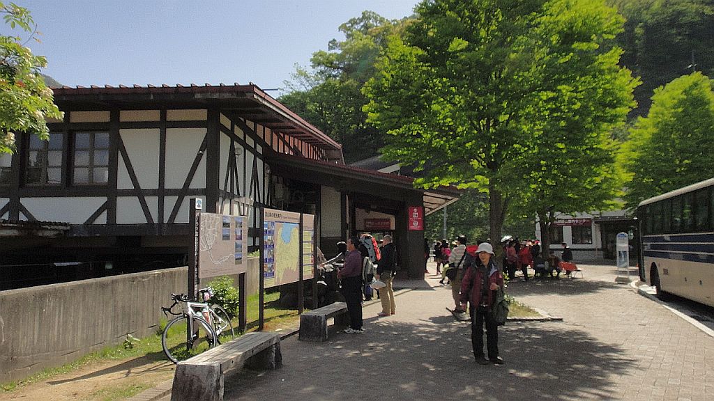 立山駅前 朝飯兼ねた補給おにぎり2個+熊王の水。台湾人・タイ人らしき団体が続々とバスで運ばれてきて日本人が少ない。