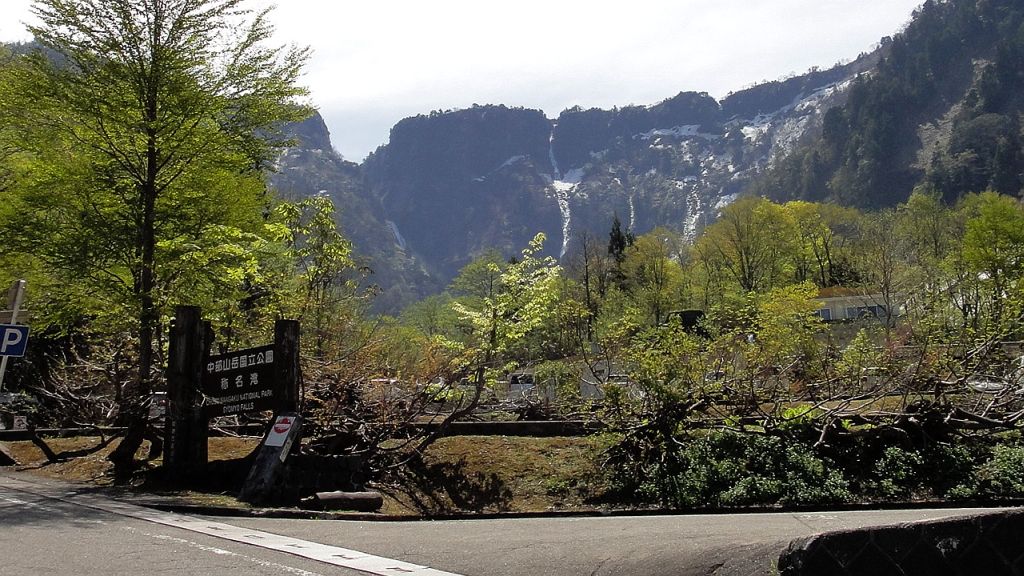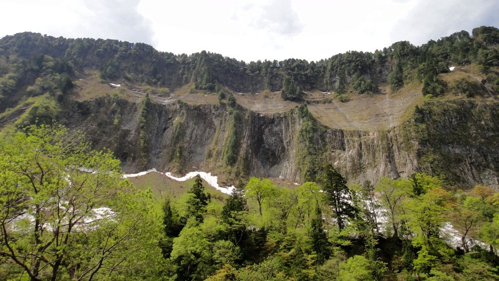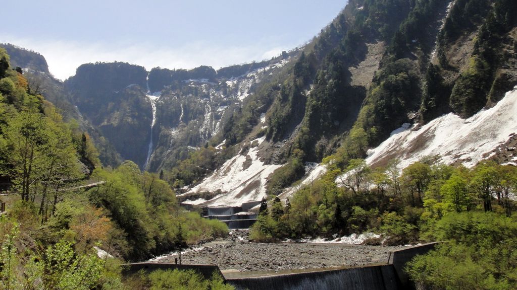 残雪と新緑 何故か日本一と認められない落差500mハンノキ滝が見事。