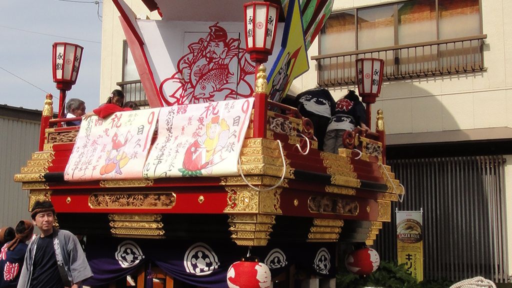 新町の山車、若い衆は日陰で一杯やりながら休憩中でした