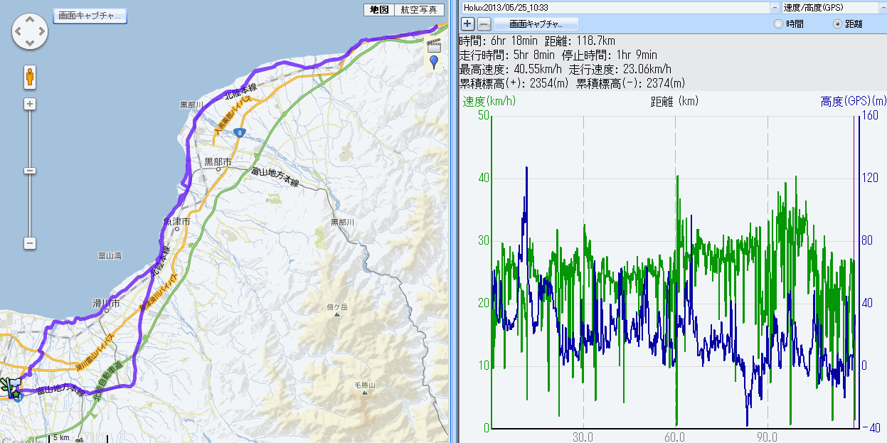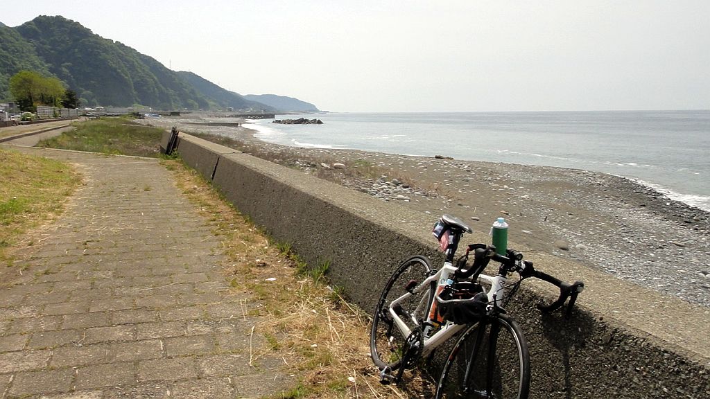 市振往復 121km (2013.5.25) グランフォンド一週間前、本日は坂無しでさらっと走ることにするも朝からトラブル(笑)があり、出発がかなり遅くなって11時前。上市往来から白龍橋、今日も剱が美しい。県道3号から県道1号で魚津の海岸線へ。さらに県道2号で魚の駅生地、昼食、明日のロードレースの前日イベントのおかげで、おにぎりや100円の鍋はまだ売っていてしかもカニorアンコウorいつものから選べ、迷わずアンコウ、美味い! 向かい風に耐えて県境を越え市振、いつもはJRの駅で休憩するが今日は海水浴場へ。一家に遊女も寝たり萩と月。海道の松も素晴らしい。アミノバイタル補給後、折り返して富山へ。帰路は追い風、ペダルが軽い。石田浜で給水休憩し帰宅。