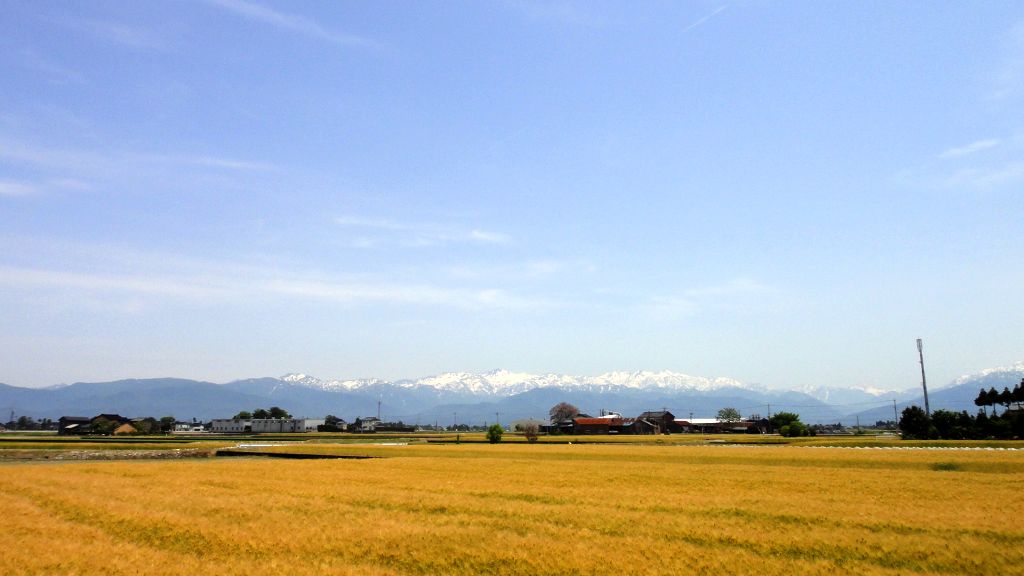 麦秋 杉沢地内から白馬岳を望む。唐松五竜鹿島槍も見える。