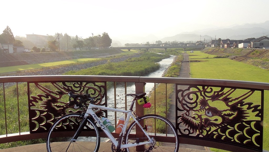 富立大橋 日の出直後は涼しくて快適、立山の稜線が見えていたが水蒸気が上がってすぐに見えなくなった。