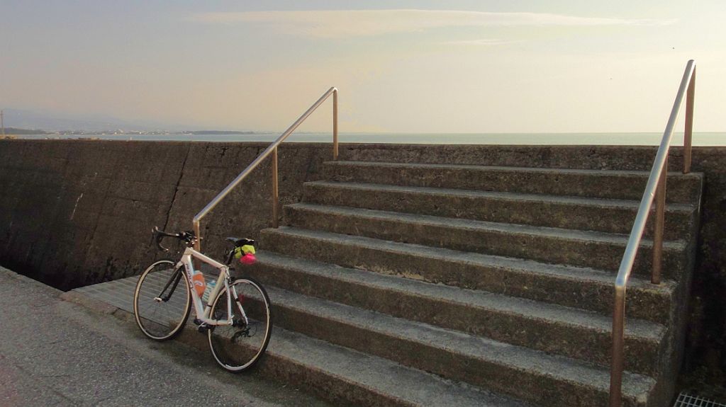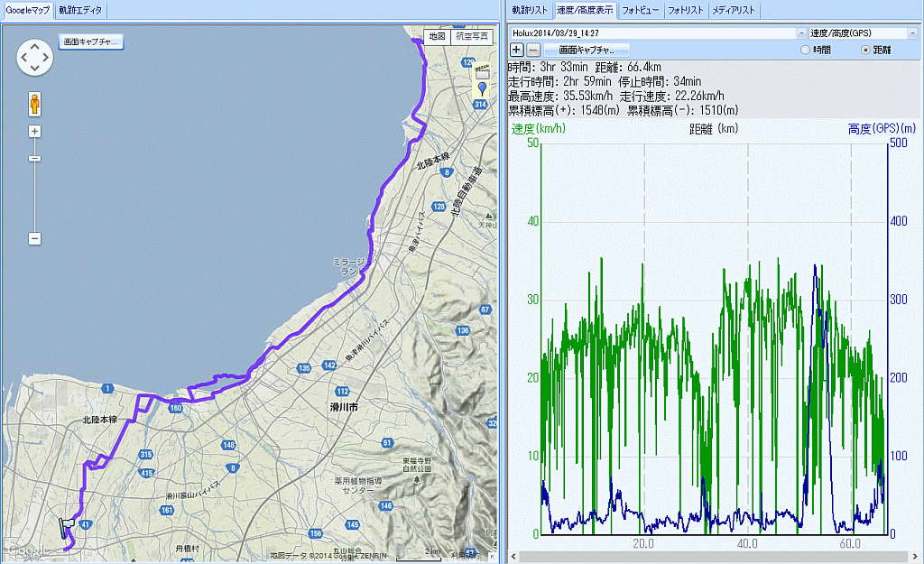 生地 66km 2014バイク乗り初め (2014.03.29) 2014年のロードバイク乗り初め、14時半自宅出発で海岸沿いに生地まで往復。黒部から走ってくる(バイクでなく足で)いたち川のメンバーと水橋〜滑川でお会いできた。 しかし、スキー以外は完全に運動不足でスタミナが無く、往路は向かい風とは言え生地までのたかだか30qでもうヘロヘロ。帰路は追い風でノンストップを意気込むも残り10qほどで ハンガーストップ気味にスローダウン。帰宅すると背中尻膝が疲労で痺れていた。体力作りが必要だけどランニングできないので自転車乗りながら身体を戻すしかない・・・。しばらくは鉄下駄ホイールで頑張ろう。