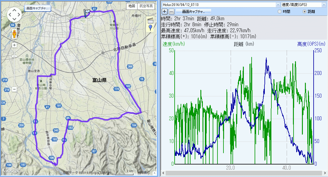 本日のロガーデータ 常願寺川土手の速度も上げきれない体力の無さ