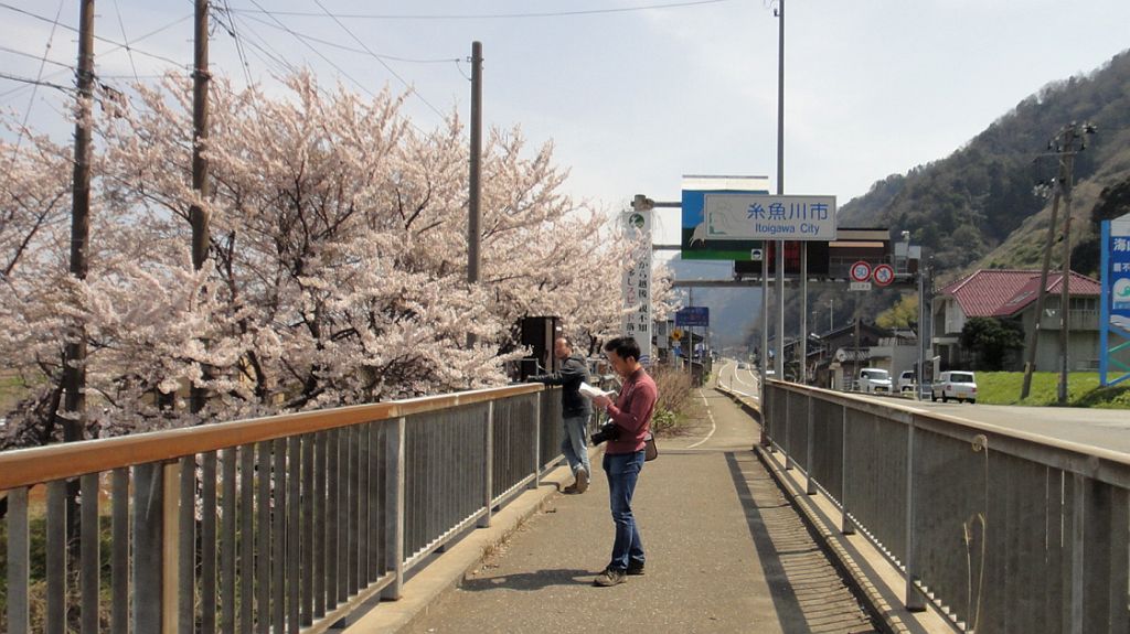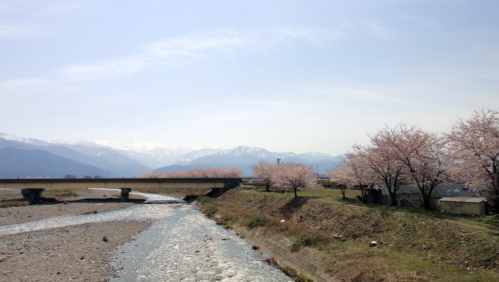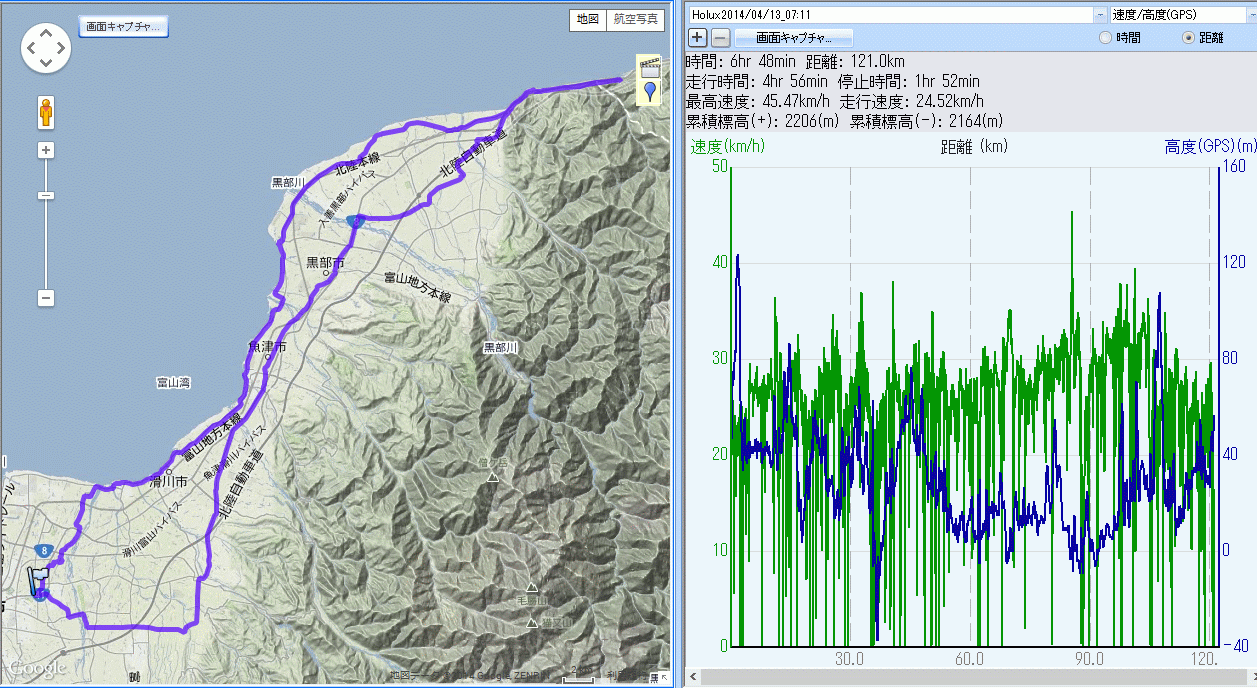 サクラサクラの市振 121km (2014.4.13) 今朝も7時過ぎにロードバイクで出発、市振定番コースへ。真新しいクリートの脱着が硬く立ちゴケの不安あるも、ホイールはRS80で加速が軽いしGP4000sも良く転がって、バイクは先週と別物。スーパー農道から気分良く上市市街へ左折した途端、携帯電話に着信(職場A氏からで不吉確定)、ビニル袋から電話を出す前に家に置いてきたスマホの050に転送されてしまう。こちらから掛ければ留守番電話、この繰り返しが3度続きようやく会話成立。昨晩遅くに社用車事故発生でその一報が何故かA氏に入ってしまった様だ。その後も当時者&上司との電話連絡で走り寸断、春霞の青空と満開の桜に残雪の山々…折角の自転車日和なのに頭の中は事故のことばかり。 黒部新牧野の711で補給休憩(パンとコーヒー)。先週は地鉄で来て散策した通りを横切り、黒部川を渡り入善から朝日町、小川はいつもより一本下流の橋で渡って宮崎へ。境市街に入ると昨秋見たのと同じ赤い布が家々に、春の祭礼で神輿と獅子の太刀舞が出ていた。県境も桜が満開、橋の上に撮り鉄さん4名。桜と北越やサンダーバードを撮影できるのも今年が最後。JR市振駅で2回目の補給休憩(持参のおにぎりと水)。帰路は海岸沿いの富山湾岸UMコース。ふと、あいの風鉄道になると湾岸UMの市振出発は大丈夫なのかと(走れもしないのに)。追い風もらって30km/hをキープして魚の駅生地で3回目の補給休憩(持参おにぎり+漁師汁、湧水補充)、今日の汁物はカニだったので汁のみをお願いすると超大盛で100円、ありがたや。魚津滑川は下ハンで頑張って回す。滑川港でまた電話着信+発信、この後体力不足のせいで速度を維持できなくなり帰宅は14時近く。当然だけども花粉症の症状大爆発。