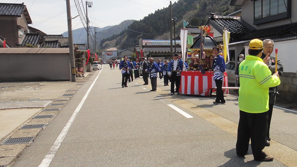 境の春祭り 赤い布が特徴的、神輿の向こうに獅子の太刀舞が居た