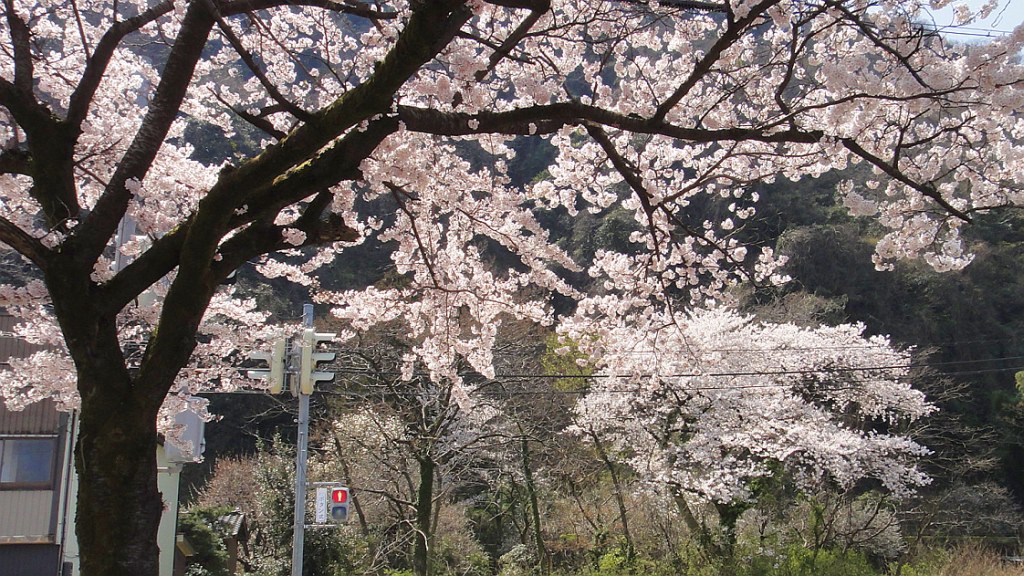 市振駅前の桜 真上に太陽があって花びらを透る光が素敵だった