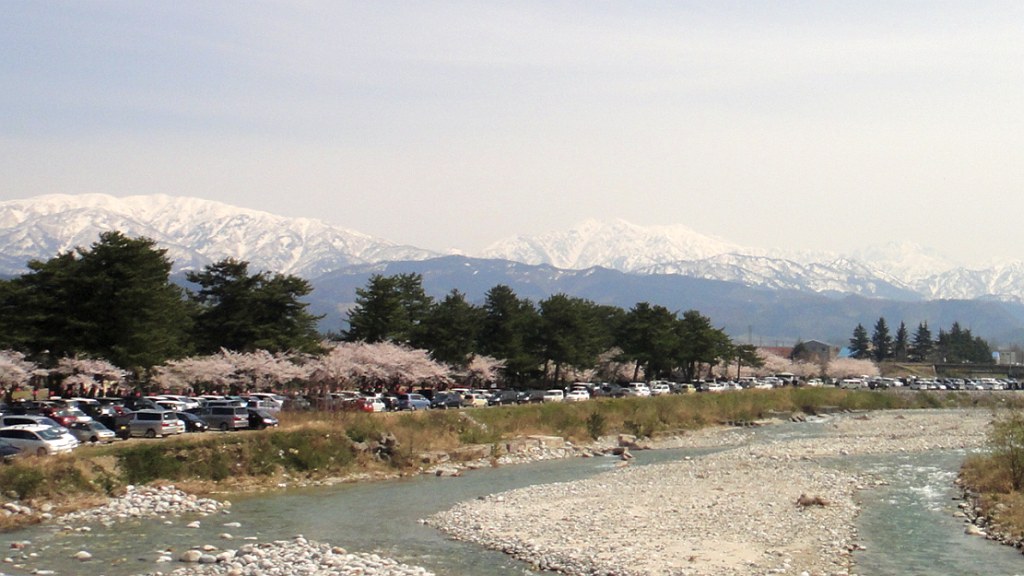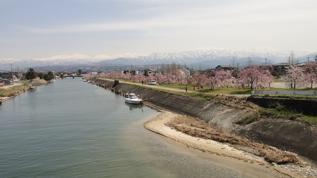 舟川の桜 対岸の向こうはチューリップ畑のはず