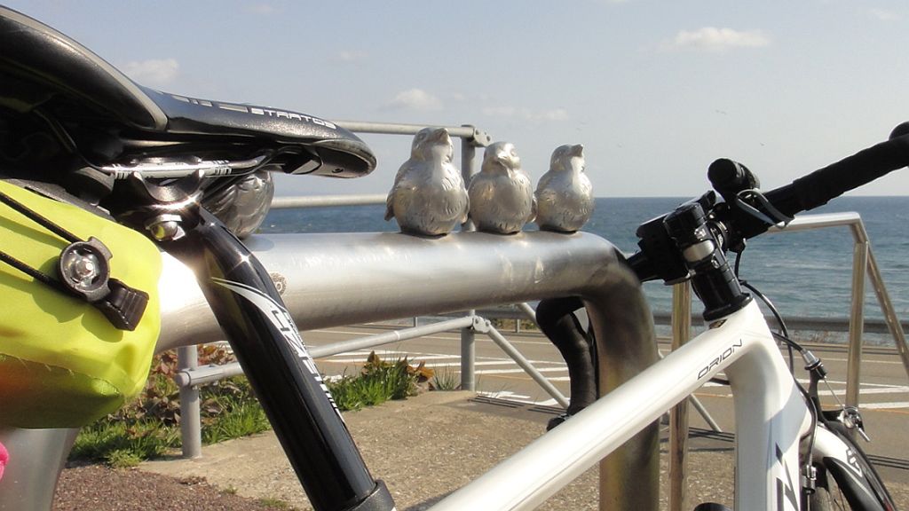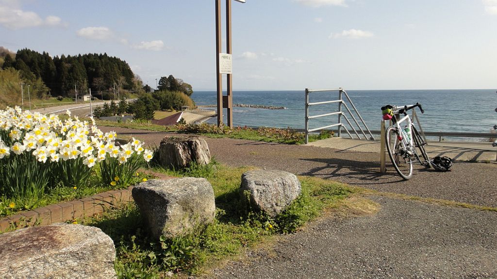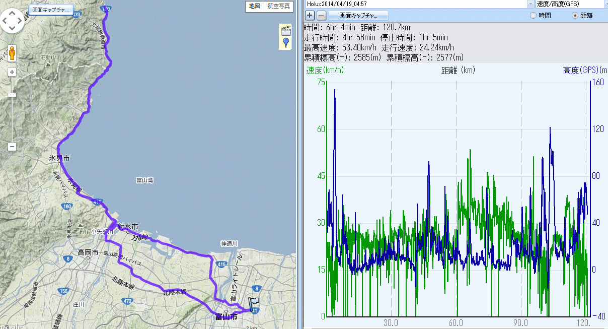 牧野大橋〜道の駅いおり 122km (2014.4.19) 4時起床、日の出前の5時に出発、今日は七尾方面へ。旧8呉羽では梨の花が満開。小杉から沖塚原、ポプラで補給休憩(パンとコーヒー)。供用が始まった牧野大橋を目指す。真新しい牧野大橋で庄川を渡り、伏木から国分、旧道で雨晴島尾氷見。かなり冷たい北風がまともに向かい風となり時速20〜25km/hが精いっぱい。阿尾デイリーで補給休憩(チョコとコーヒー)、R160を北上、朝早いのでローディーはまだ見掛けない。強い向かい風を堪え道の駅いおり8時5分到着。補給休憩(持参おにぎり+持参水道水)。折り返して追い風サイコーで氷見漁港までノンストップで回す。途中4名のローディーと挨拶。松田江浜から雨晴新湊はゆっくり流して越ノ潟9時55分着、補給休憩(持参おにぎり+持参水道水)。今年初めて乗る10時7分の渡船は「こしのかた」、波もあり寒いので初めて一階船室。堀岡からは北風に東の成分が増えて向かい風。我慢我慢で四方、桜谷まで追い風で楽に南下、あとはポタリングで丁度11時に帰宅。予定より1時間早かった。