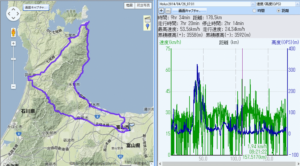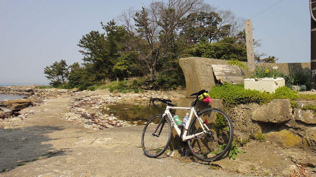 一年前の落車自戒の県道29羽咋七尾 179km (2014.4.26) 朝7時半過ぎに出発、ロードバイクを始めて50回目の記念?走行は1年前の落車負傷反省自戒で落車現場へと向かう。高岡市内で工事中の道を若干迷走後、3回目の訪問になる国吉ローソンで休憩、ネコは居なかった。県道29のヒルクライムへ、野鳥やカエルの声に癒されつつも、三段のupdownで心拍数が年齢限界超え。赤毛トンネルを抜け、昨年落車した現場、転んだ場所が何故か新しいアスファルトに。氷見の山中はサクラもレンギョウもまだ満開。県境を越え宝達志水町&羽咋、千里浜レストハウスでイカダンゴ休憩。連休初日であるが意外に空いている。昨年と同じ道がイヤでR159を追い風に助けられ七尾へ向かうも残り7qで向かい風になり、苦しみながら七尾港で大休憩。崎山半島観音島は今年も素敵だった。NHK「それでも俺たち網を引く」の鹿渡島定置の基地と能登島の景色を楽しみ南下開始、先週走ったR160は今日も追い風、一気に阿尾のデイリーへ、補給休憩。1607の県営渡船に乗り、今日は射水線跡ではなく神通川右岸道路から帰る。17時過ぎに帰宅。ほぼ180q疲れた〜。 <<過去の崎山半島>> ・ランニングで(裏湾岸UM、最後の長距離走) ・碁石ヶ峰、鹿島少年自然の家経由 ・県道29で落車負傷の後