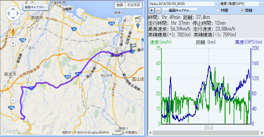 本日のロガーデータ 庄川水記念公園すぐで何故かダウン 後半の超高速巡航のデータが無く残念