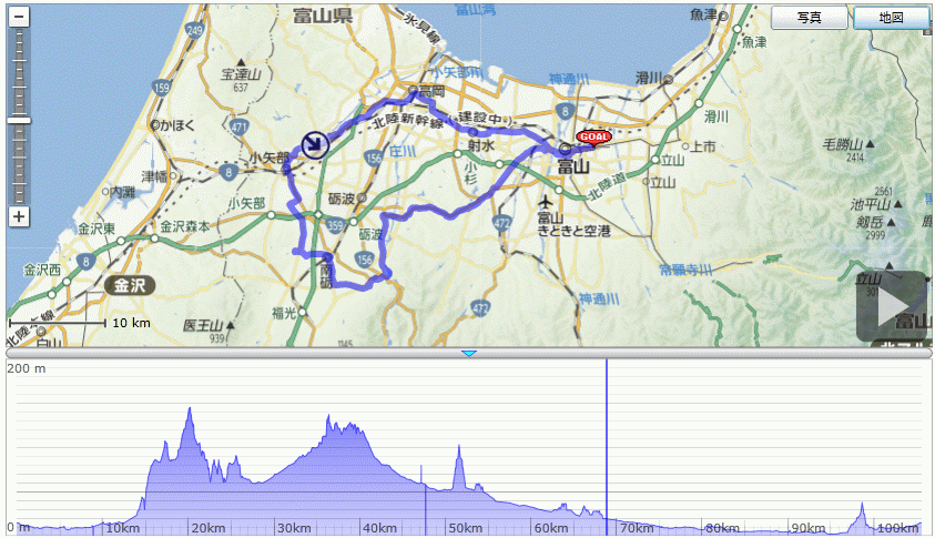 代わりにルートラボの絵 大した坂が無くさらに帰路は庄川町以降は追い風で楽な100qだった