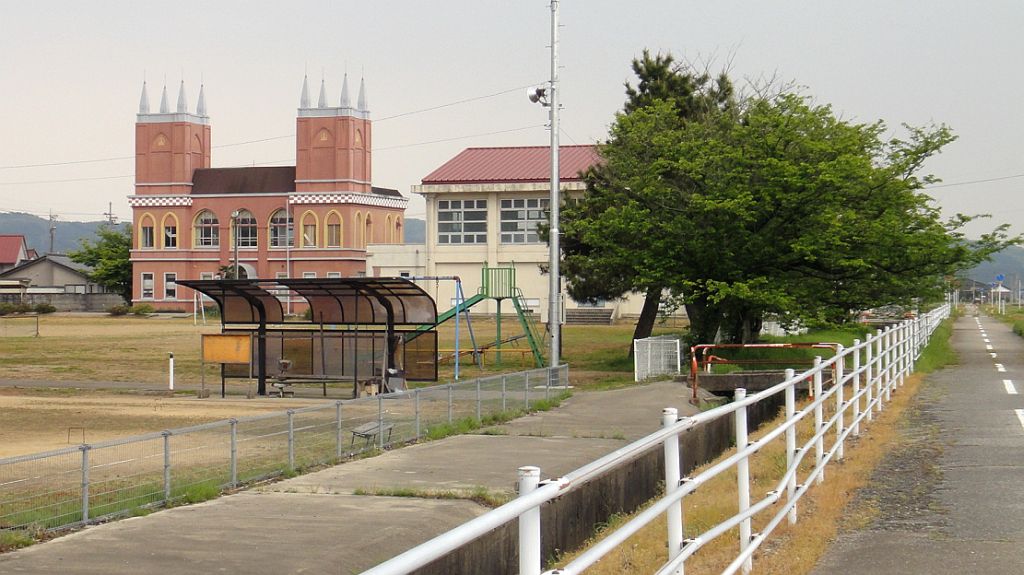 小矢部の自転車道 「止まれ」が多過ぎでストレス溜まる道です。小学校は有名なメンヘルいやメルヘン建築の様です。
