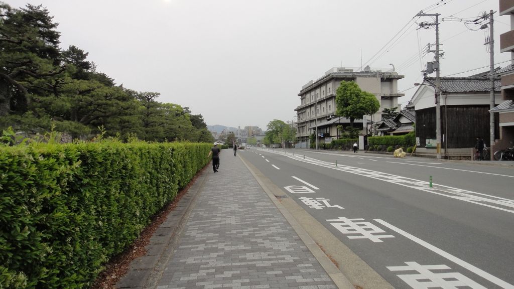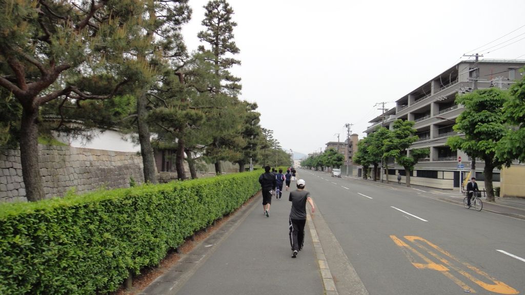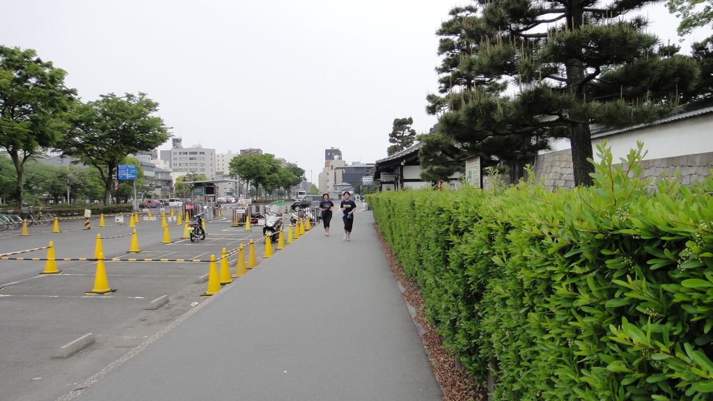 京都二条城周回ジョグ&ウォーク 2014年5月5日 妻子が黒部名水RR改めマラソンさらに坂井市古城マラソンの5kmにエントリーしており、その練習始めとして、またまたまたきっかり一年ぶりに京都の朝ジョグ。今年は自分がジョギングすらできない状況なのでは、手軽な二条城反時計回りの周回。妻子は2周ジョグ、自分は1周ウォーク、加えてホテルまでの往復。二条城周回コースは1周約2km、走る通りは北西南北の順に竹屋町通・美福通(びふく)・押小路通・堀川通。トイレも飲料自販機もあり、信号も無く、開場の8時45分までは観光客も居ないのでストレス無く走れるコースである。ホテルからの往復は堀川の親水公園も使える。