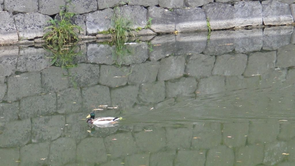 マガモ この時季に居るとは?堀で飼われているのかな?