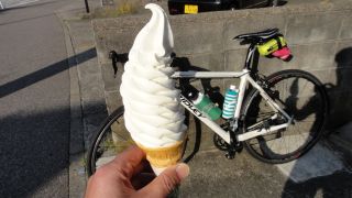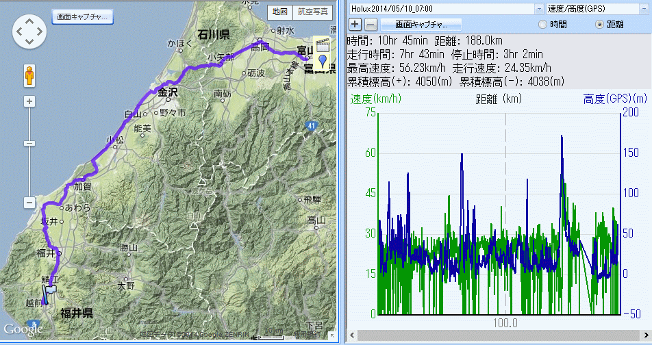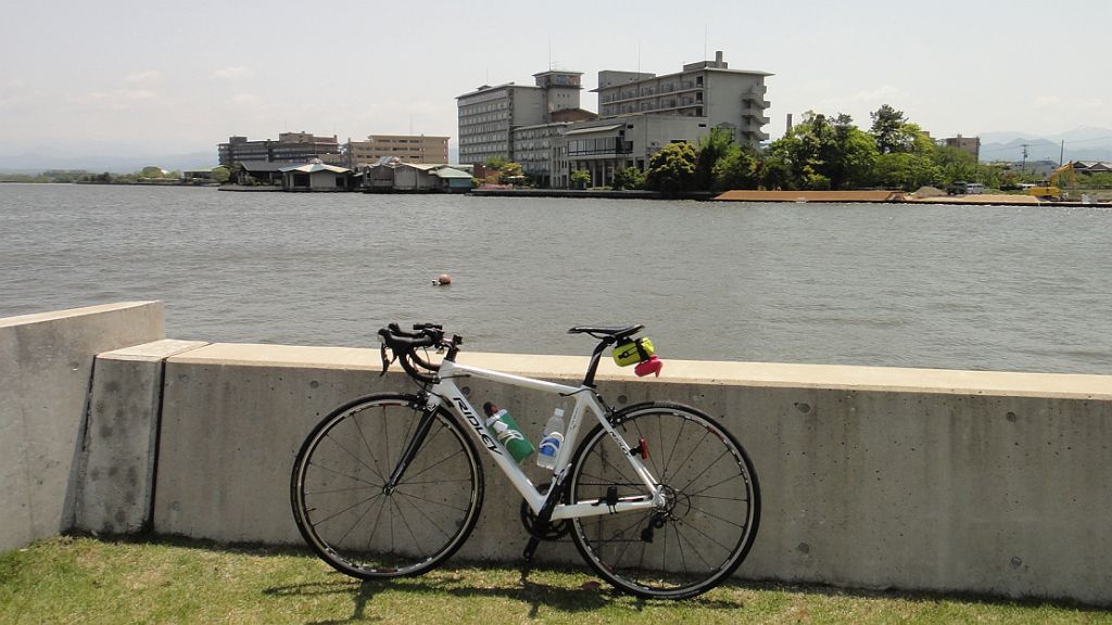 Chinon-Ball No.1 武生→富山 193km (2014.5.10) 福井からのロングライド、来週土曜のつもりであったが一昨日思い立ち本日決行。昨晩宴会にて帰宅が23時過ぎ、風呂で酔いを醒まし、輪行バッグに自転車を詰め携行品を用意できたのが1時半、2時間ほど仮眠し起床。家内を無理矢理起こし富山駅北口に送ってもらう。券売機前で福井にするか武生にするか一瞬迷いつつも武生選択4750円、4:56発のサンダーバード2号で輪行、武生6:32着。武生駅前交番横で自転車組立て、服を上下一枚脱ぎ、バイクシューズに履き替え、家に宅配する荷物をパッキング、これだけで40分近く経過。最初に見つけたコンビニ・ファミリーマートから荷物発送、国道365の吉野家で朝食、見込みから1時間遅れの武生出発となった。 県道23号を北上、強い向かい風でロードサイドののぼり旗はすべてこちら向き。鯖江市内は西山公園傍から旧北陸道へ、水落の町並みが美しい。この道が江戸時代から我が家の前まで続いているかと思うと感慨深い。福井市に入り、浅水あたりで旧道を見失いフェニックス通りで福井市内へ。市役所前の711の100円ホットコーヒーで休憩、水1本購入。福井大学前まで裏道、藤島通を西進、日野川を渡り山沿いの道へ。向かい風はさらに強くなり25km/hも出ない。布施田橋で九頭竜川右岸土手へ、向かい風さらにパワーアップ。この風地獄いつまで続くのか。時間があれば東尋坊や雄島方面を回るつもりだったが、時間も体力も心配になり三国から芦原温泉へ。50q手前のローソンでオレンジジュース&アクエリアス購入休憩。店横の観光地図で国道305と県道29の二択で県道29選択。向かい風を除けば北潟沿いの道は適度なアップダウンとコーナーが続きとても美しい。時間あれば吉崎御坊にも寄りたかったが、この向かい風では時間が惜しく先へと進む。 石川県県境10時50分頃通過、大聖寺駅前から旧道、左折して片山津温泉へ。柴山潟をほんの数分眺め、片山津IC近くのサークルKで補給休憩、オニギリと串カツ。まだ80qも走っていないが120qは走った疲労感、残り100q以上。海岸沿いの県道20号はこれまたキツイ向かい風、耐えに耐えほぼ中間地点の手取川を渡ったのが12時45分、昼は津端の森乃庵の気分であったがこれは無理。徳光PAで昼食休憩、道の駅側の店は納得できない値段設定で高速側のうどんコーナーまで歩いて月見うどん。これでまだ100qしか走っていない。ストレッチと膝回りのマッサージ後に出発。しおさいロードで金沢市に入る。この道は新潟の国道402を思い出す。健民海浜公園でついに向かい風から開放、走行110q超の14時。毎月通った8年前が懐かしく遠回りして石川さん前を通り、海側環状横の遊歩道、ローザンヌ前から三ツ屋駅構内を突っ切り浅野川、ミサゴが飛んできた。森本から旧道に入るとまた向かい風、何故だ〜と泣きが入るも、津端からついに待望の追い風に。道の駅くりからで峠前の休憩、140q走った脚に天田峠のきつい上り。マイリマシタ。 富山県に入り、追い風と下り坂で一気に小矢部市街。福岡町からいつも通りの旧道で高岡へ。まじまの十段ソフトで最後の補給、先週とまったく同じ道で帰宅、走行193qであるが向かい風はツラカッタ、実質は200qオーバー間違いなし。 ★輪行活用の片道ロングライドを「チノンボール」と勝手に名付けて楽しむことにした。今回はその第1回目である。