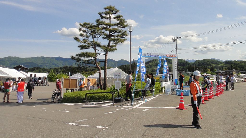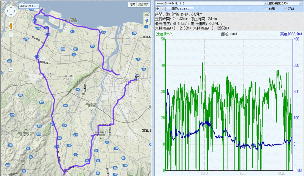 八尾新湊 67km (2014.5.18) 昨日の葬儀の疲労が理由でもなく今日はロングライドの気力無く60qほどをさらっと走ることにした。地鉄上滝線沿いに南富山、笹津線跡から富山空港経由で神通川を渡ると左岸にランナーらしき複数の姿、何だろうと土手に行けば「とやま清流マラソン」であった。ランナーを辞めると県内の大会の開催日すら知らず…。しかしこの時間では制限ギリギリで歩いている出場者多数で応援の声も掛けづらい。ゴール地点に行けばGパンさんと遭遇、すぐ横に埼玉県庁ではなく埼王県庁のランシャツを着た川内選手そっくりさん(2時間40分でゴールの本格ランナー)。お別れし八尾へ、旧町へは上がらず千里長沢小杉と下り、そのまま一気に海王丸パークへ。渡船の時間合わせ兼ねてソフトクリーム休憩。1637の渡船こしのかたで堀岡に渡り、1730には帰宅すると宣言してたので、30km/hで巡行、前方にローディー2名、追い付けばROMANの5文字、意味不明に36km/hまで加速して追い抜き、振り切ったことを確認しつつ四方から射水線跡を南下。八町あたりで、何故こんな馬鹿げた走り方をと自己分析、ペースの合わない他人と微妙な距離間に居るのが生理的にイヤなのかも。北大橋から雲のほどけた立山連峰が美しい。環水公園でJNさんと遭遇、4か月の禁酒も来週の黒部名水のフルマラソンで終了されるとのこと。頑張って下さい。