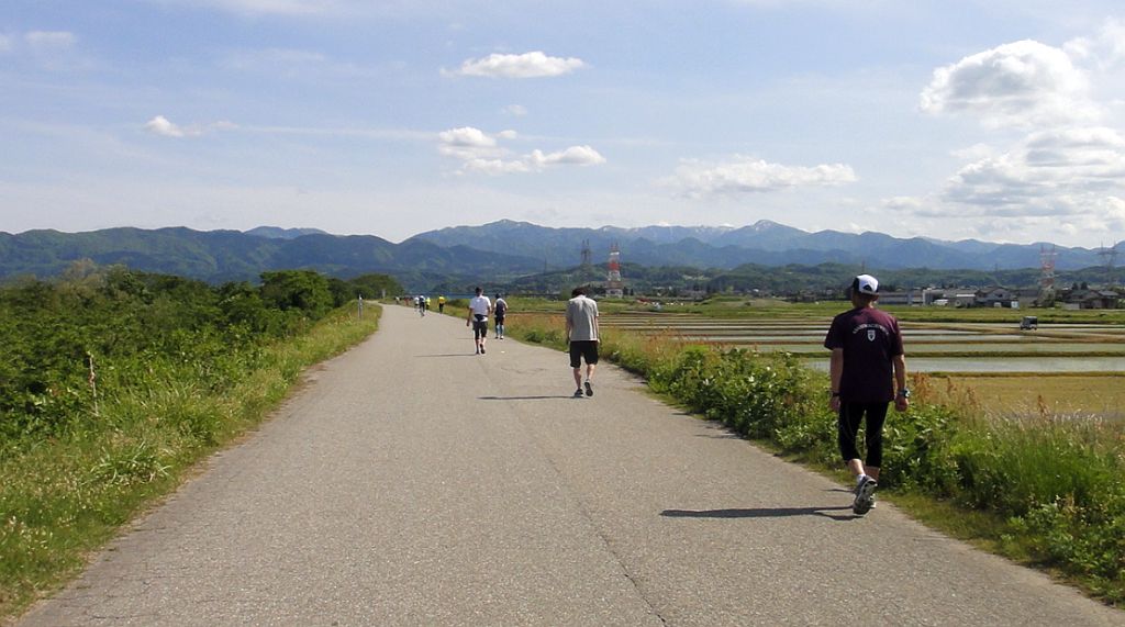 とやま清流マラソンの選手たち 制限時間7時間ギリギリでは走れない人ばかりで、ガンバレとも言い難い。と言う自分も3年前はラスト8q歩いて3時間40分ほどでゴールしたけど。