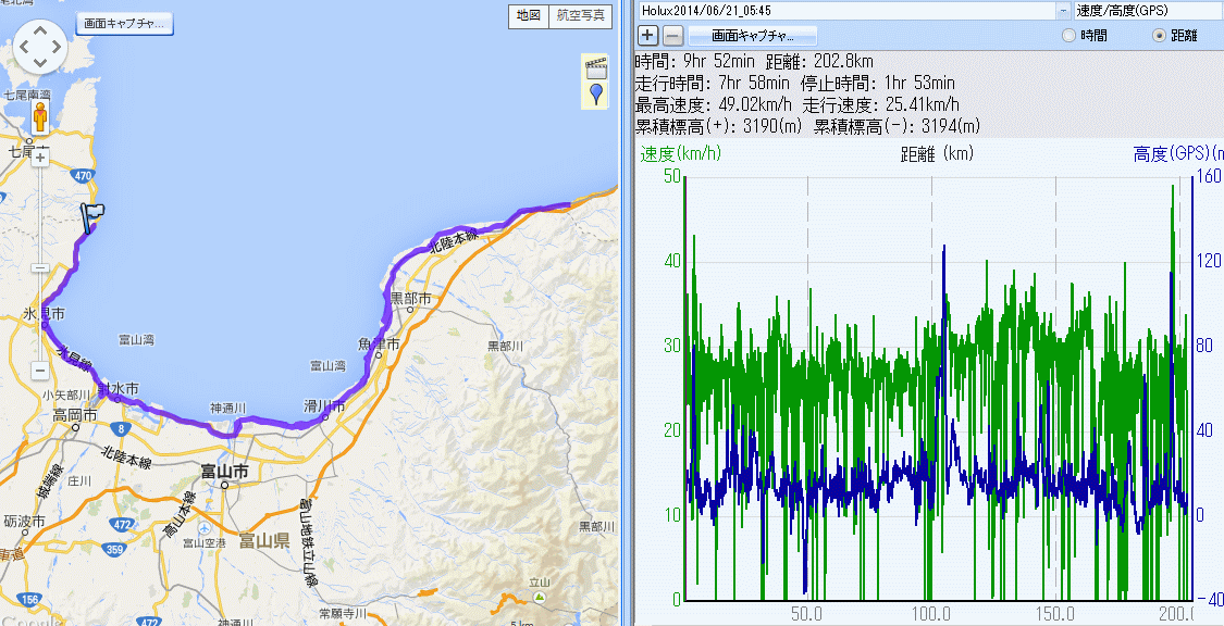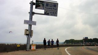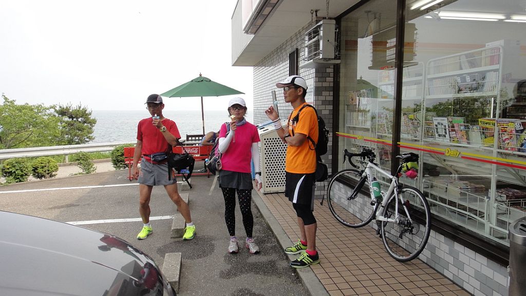 出発は5時50分、いつもの様な休憩含めた平均時速20km/hであれば戻るのが15時50分、自分が100qを走った時はいずれも15時半にはゴールしており微妙な時間である。休憩を減らしかつ走行速度を若干上げてみた。バイクから降りたのは渡船、滑川サークルK、入善の湧水、市振、折り返してからは、石田浜湧水、海の駅魚津、渡船、前山冷菓、以降はランナーと会う度(笑)。雨晴で100q、番屋街過ぎで30q組とO監督、阿尾で50km組にそれぞれ追い付いた(途中氷見市内のドラッグストアで買い物とウロウロ。)。皆より先に一人でゴール、15時40分。市振までの往路は4時間、帰路は追い風で堀岡まで平均30km/h以上、実走行時間7時間58分にまずまず体も出来てきた実感。200q超を一日で走るのは先月の新潟→富山以来、速度も上げたせいで疲労も大きかったが達成感もそれなりに。