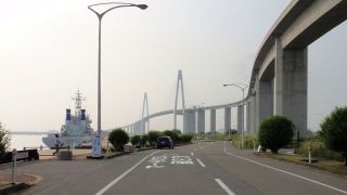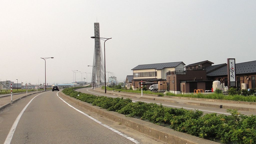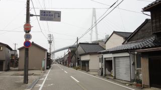射水市、大橋を見上げる旧道の景色