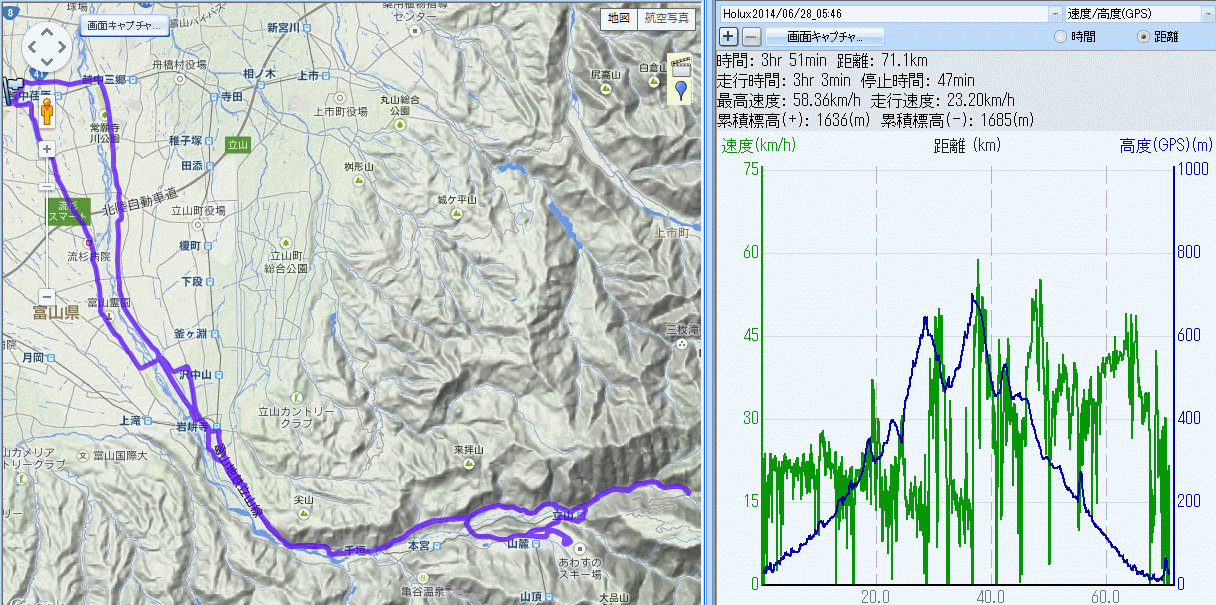 粟巣野桂台・立山登山マラニック最終回応援 71km (2014.06.28) 5時起床、5時50分出発。昨年中止となった立山登山マラニックが本日に延期開催、今年がとりあえずの最終回で、過酷なコースに挑むランナーも見納めであり、出場者のガッツをもらいに応援ライド。もう少し早起きできれば岩峅寺で応援できたが、千垣〜桂台間での応援となった。hisaさんには芦峅寺手前で追い付き会えて良かった。 一旦粟巣野スキー場まで上がり、ロッジわがや前でおにぎり補給休憩、立山駅まで下りて称名道路へ。大学の後輩でアミノバリューRCのY瀬さんが走っていた。今年初参加とのことだが凄いペース。桂台のゲート前で私設エイドを出しておられた方は、入善高校のH田先生59歳、miyaさんの知り合いらしい。そこでランナーを応援、hisaさんが到着してから下りながら応援、大勢のランナーに手を振り声を掛け沢山のパワーを頂いた。そして最後にお会いしたのはbluemoonさんこと万葉健友会のK村さん、久々にお話しできてよかった。 芦峅寺からポツリポツリと雨が降り出し、横江で本降りに。下界は晴れているかと期待するも岩峅寺まで雨。当初は大沢野から八尾小杉を回るつもりであったが、八尾方面も雨に見える。本日は降雨コールドとし、常願寺川土手左岸道路を下る。100qは走りたかったが71q、雨では危険、仕方なしで帰宅。