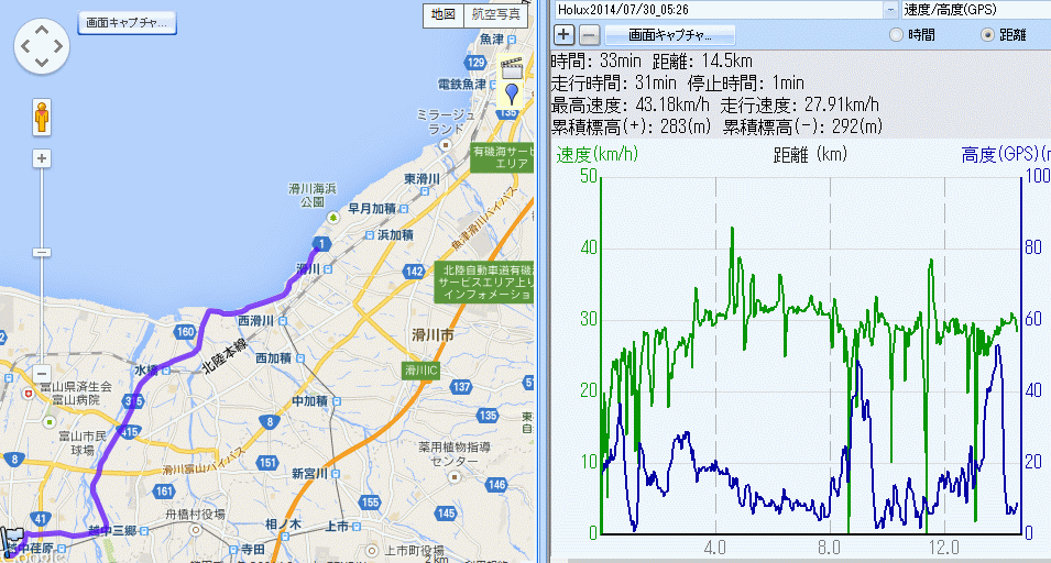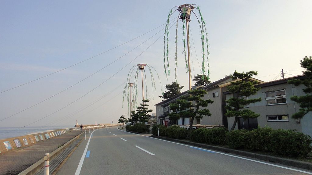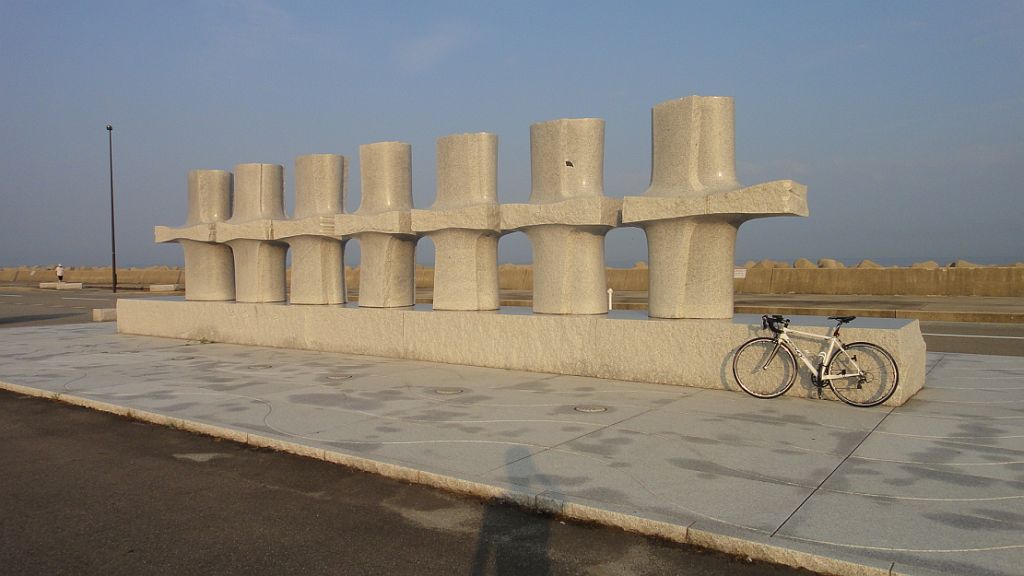 朝飯前の魚津港 47km (2014.07.30) ロードバイク、2週連続で週末に乗っておらず今週末も旅行で乗れず…。このまま体力が低下するのが惜しく平日の朝練。5時起床、準備30分、5時半出発。上市往来で常盤橋を渡り常願寺川右岸道路から水橋辻が堂、県道1号で滑川、坪川交差点で救急車の音が間近に。早月川を渡って魚津、ここで折り返せば40qだが、埋没林博物館向こうの海岸線が見たくなり魚津港へ。今週末の祭りの準備でたてもんが並び始めてる。風の地平線千年の夢前で補給休憩。折り返す。滑川では警察がトラックと軽ワゴンの事故処理中、先ほどの救急車は軽四に乗ってた人を運んだ模様。白岩川には水橋橋まつりの提灯がまだ残っていた。浜黒崎から野田、1800m農道で針原、アルペンスタジアム経由で帰宅。休憩入れて走行時間1時間45分、この程度なら27〜33km/hで回し続けられる。短時間集中走も気持ち良し。