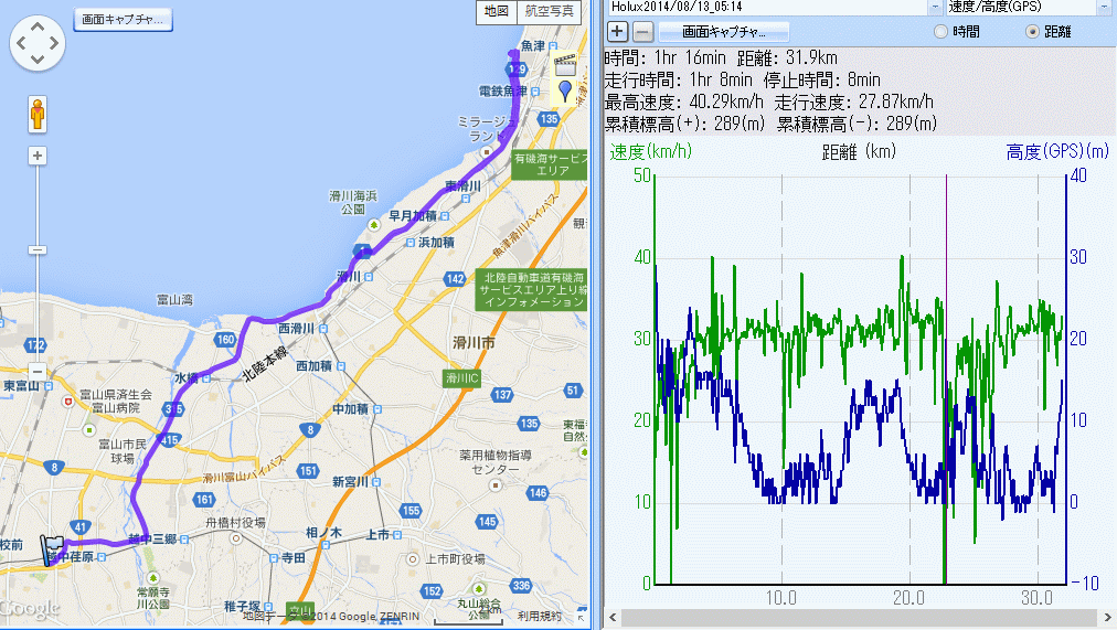 本日のロガーデータ 使いさしの電池のため、31q地点で切れた様だ。往路はまずまずの速度、35km/hで1時間巡航できる様になりたいが、初老に進化は厳しいか。