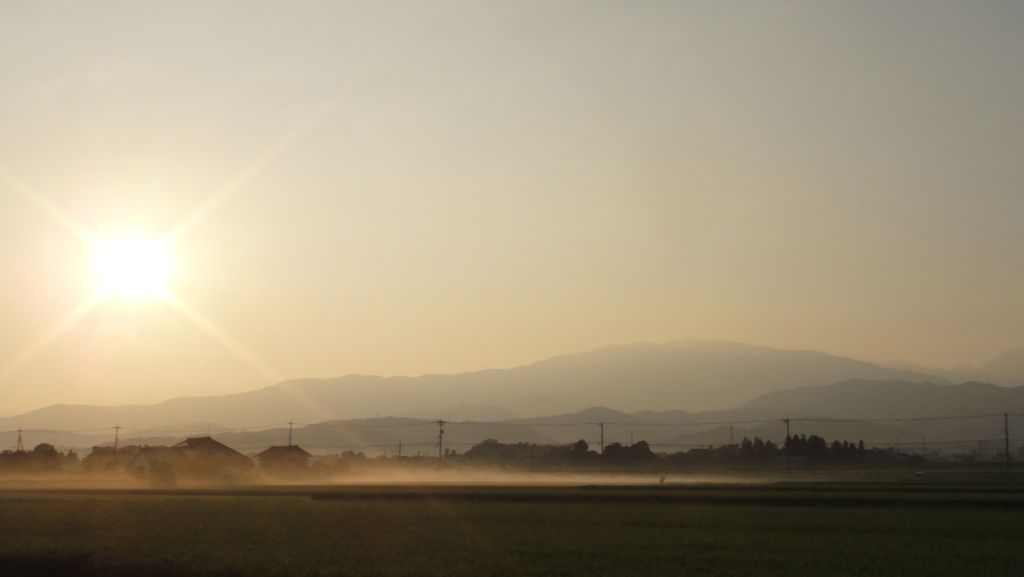 農薬散布@滑川 写真にすると逆光で綺麗に見えちゃう