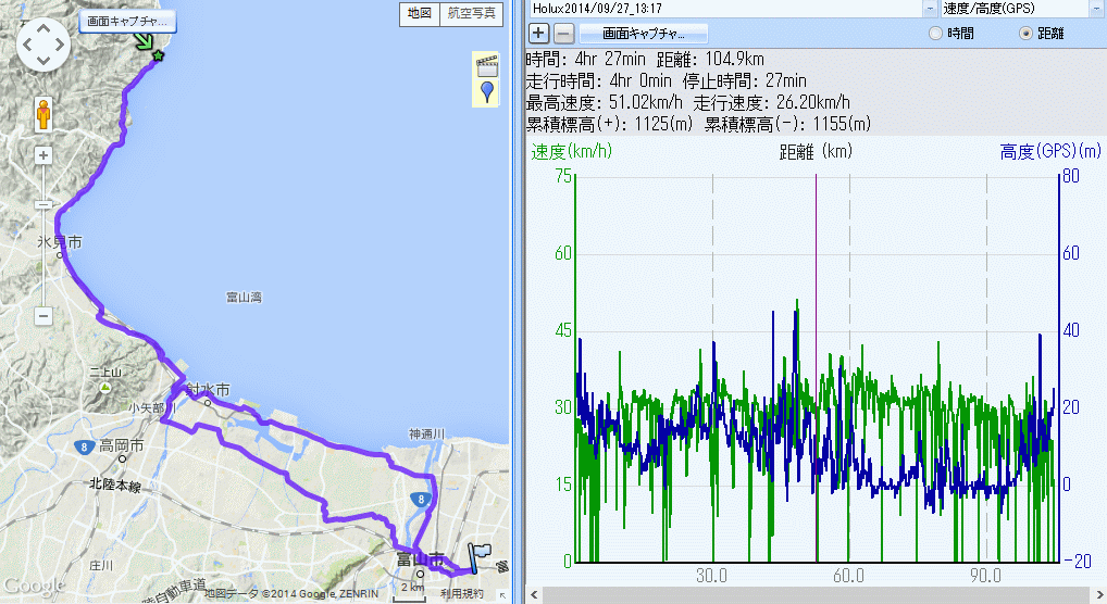 ▼ロガーデータ 4:27、104q、ave26.2q/h ▼PanoComputer total 99.74q 3:49 ave 26.1km/h 60rpm 124bpm max 50.6km/h 105rpm 187bpm 計測までのタイムラグ大きく数百m欠落とみた