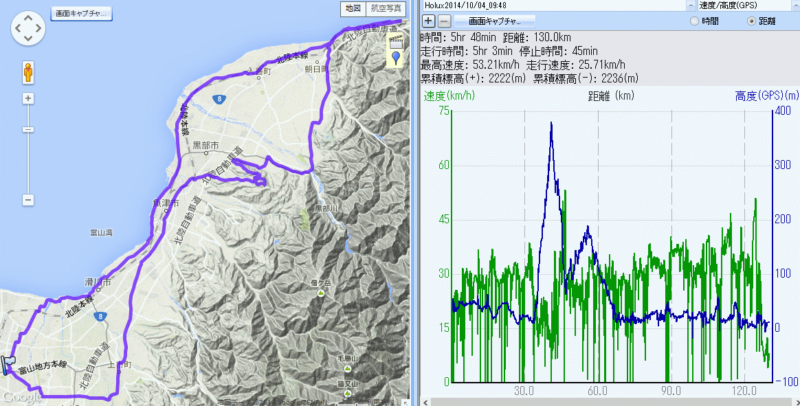 新川育成牧場・市振 雨雲と競争 130km (2014.10.04) aeroadの登坂性能を試すべく、長くもなく短かくもない坂でと新川育成牧場へ。田家の711で補給後、1年半前に上った同じコースに取り付く、ridley orion比、車重マイナス1kgとフレームの硬さの差は歴然、23Tもほとんど使うことなくあっさり上り切る。さらに軽い自転車だとどんなだろう…。頂上駐車場付近でローディ多数、単独の方、男女8名程度のグループ。宮野運動公園まで下りスーパー農道+県道14旧道で愛本橋、フロントライトをうっかり忘れたため、トンネル通過を強いられる宇奈月温泉は断念、舟見から山沿いで市振を目指す。強いアゲンストの北風だが下りなので速度維持。 海が近くなると北側の海上に黒い雲を確認、北西側には明らかなシャワー、雨に遭わずに帰宅できるか不安に。宮崎漁港付近は道路工事で自動車は通行止めだったが自転車は通してくれた。ただし砂利道。キャンプ場向うの踏切が通行止め、ダメモトで海岸沿いに堤防道路?を進む。途中砂利道があったがそのまま境川河口手前で北陸線を潜れた。県境を越え市振道の駅到着間もなく雨が降り出し、昼食はヘルシー定食の気分であったが自転車下りずにUターン、右手は雨雲、正面に太陽、朝日〜入善は時々降られるも黒部川を渡ってで雨雲を振り切った。しかし、ヒルクラムも含め60qほどを無補給で約30qは全速力、もうヘロヘロ。 魚の駅生地に寄るも14時過ぎでは補給には微妙で湧水を汲んで再出発、結局魚津水族館近くのローソンでオニギリとジェルで補給したのが14時45分、帰宅15時40分。乗車3日目でaeroadを雨で濡らしたが、aeroadだから雨雲を振り切れた? 今回もロガーのデータそのまま