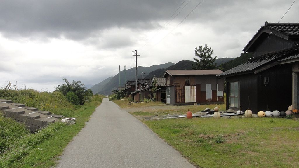 舟屋? 北陸線からは舟屋の様に見える建物が散在、昔は砂浜だったのだろうか?