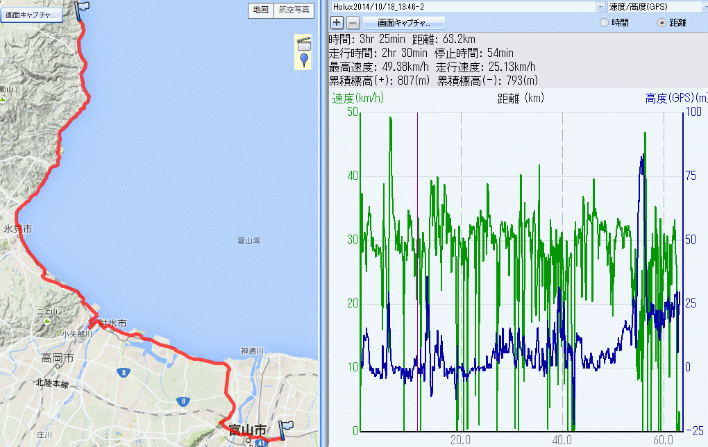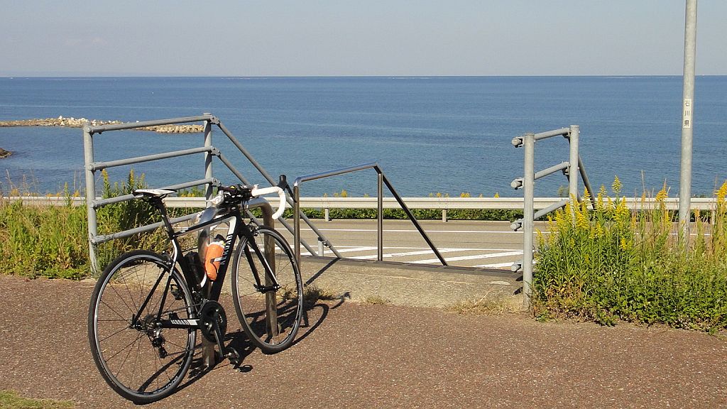 道の駅いおり往復+呉羽山・立山遠望の一日 130q (2014.10.18) 10時半に出発、環水公園では明日のあいの風RMの準備、神通川右岸土手経由でR415へ、立山連峰ががきれいに見渡せ、今日の日和なら西へ行っても東に行っても失敗は無さそう。無計画に出発したが西へ向かう。1114の渡船で海王丸パークへ、海保やひこの定位置に巨大客船が見える。傍まで行けば「ぱしふぃっくびいなす」日本第2の客船が来航していた。庄川手前で前輪から不思議な音、路面のせいかと思えば、コーナリングで強烈過ぎるアンダーステア、何事かと停止すれば前輪がスローパンク。小矢部川右岸でチューブ交換・約20分格闘、ミニポンプでは十分に空気を入れられず、安全のためには帰宅すべきであるが、高岡市内あるいは氷見市内の自転車店のほうが自宅より近く、騙し騙し氷見まで走行、かわもとサイクルで空気入れを借り、ついでに予備チューブを1本買うもTNIの激重100gが750円ですか、むーー通販の倍だな、ま、仕方なし。 気を取り直してR415を北上、道の駅いおりへ、空腹を感じたが明るい内に帰宅したくコーラ1本補給後折り返す。帰路は若干向かい風であったが、海越しの立山連峰の絶景をずーーっと楽しめる贅沢。今日は筋トレ兼ねて九殿浜と有磯小の坂は往路復路ともアウターで上がった。リドレーであれば相当キツかったはずも、aeroadはアウター+21Tで上がれたがもちろん筋肉は大悲鳴。阿尾デイリーであんぱん&コーヒーの遅い昼食。比美の江公園や雨晴からも立山連峰眺めつつのライド。県営渡船は微妙に時間が合わず、徒歩で新湊大橋、今日は豪華客船にイベントもあって遊歩道は盛況であった。 四方からいつも通りに射水線跡を南下、立山が夕日に染まり始めたので御廟口から呉羽山を上った。取り付きの数十メートルが20%近くありそうな超激坂であるが、それを超えればせいぜい8〜10%、とは言え今日初めてインナーを使う。山頂は立山を観に来た方々が十数名、三脚でカメラ構えた方が5名。自分も3〜4枚撮って神通大橋富山駅前経由で帰宅。今日のライドではついにセミの声を聞かれなくなった。先週城端の山中で聴いたツクツクボウシが今年最後のセミかも。モズの高鳴きは先々週あたりがピークだったのか少し減った気がする。深まる秋は音でも感じる。しかし、ロガーデータは大爆笑だった。ウガンダやアルジェリアや水深1000mまで潜ったり、aeroadは凄いバイクだ。