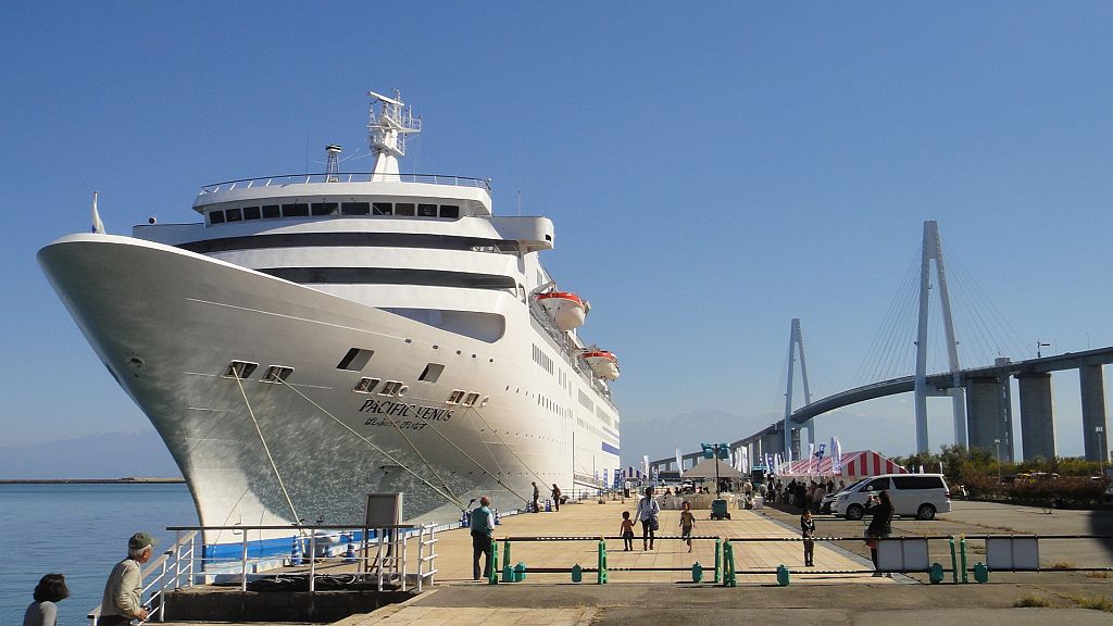 ぱしふぃっくびいなす来航 青空と立山連峰、乗客はラッキーでしたね