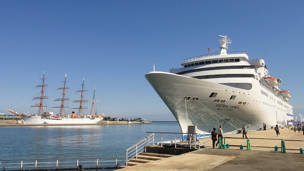 飛鳥Uに次ぐ日本で大きさ2番目の客船 対岸は海王丸