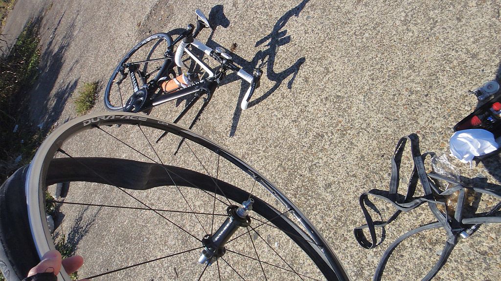 aeroad初パンク 突然のアンダーステア、スローパンクに気付いた。庄川と小矢部川の間でチューブ交換、氷見まで騙し騙し走って、かわもとサイクルで空気入れを借り、替えのチューブ購入。想定外のロスタイムであった。