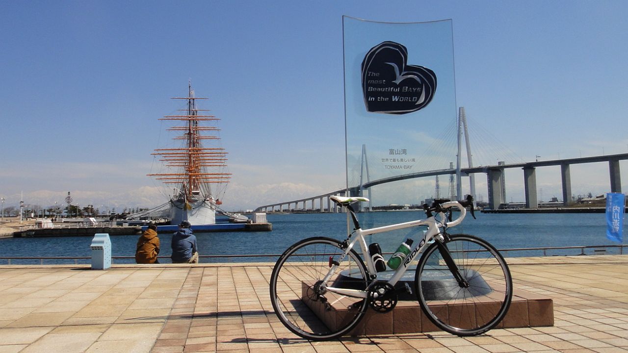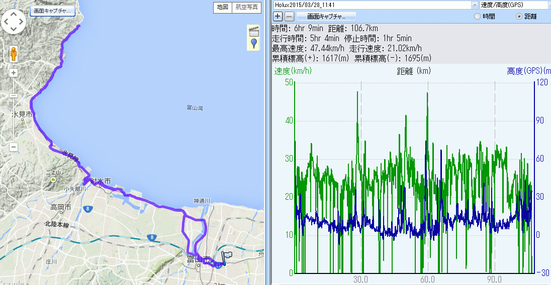 2015年初乗り七尾県境100q (2015.03.28) 2015年走り初め、11時40分過ぎに出発、東と西で迷ったが帰路の追い風期待で西へ。七尾側県境までのほぼ単純往復。自転車は筋トレ兼ねてリドレー+鉄下駄、ウィールはやはり重くてストップあるいは速度低下する度に加速するのが大変だった。県営渡船は廃止あるいは減便の噂あるが3月なので時刻表は昨年と同じだった。多古爺で補給昼食にラーメン、ニンニク入れ過ぎて自分で自分が臭い。氷見からは海越しの立山連峰、透明度は昨日のほうが高かっただろう。県境でウグイス初聴。 折り返して、氷見港までが向かい風であったが後は四方まで追い風に助けられ、四方から富山はヘロヘロになりながら我慢我慢で漕いで帰着。富山市体育館前で黒部から走ってきたKMさんkinyaさんサイクル森さんロナさんと遭遇、Kさんamiさんriicoさんはまだ走ってるとのことだった。来週は鉄下駄をRS80に変えて距離を延ばしたいが、週間予報は雨、GF富山まで脚を作れるか心配である。 今回もロガーのデータそのまま