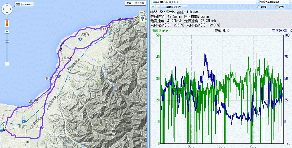 市振 120km (2015.04.04) 2015年2回目のバイクは今日もridley、鉄下駄のつもりであったが水溜りがある様で、滑りやすいrubinoよりGP4000のほうが少しは安全かとRS80に変えて出発。晴れの予報であったがずっと曇り、気温も花冷えで向かい風の強い往路はシューズカバーが欲しいくらいであった。いつも通り立山町利田から上市白龍橋から滑川魚津と抜け黒部桜井高校近くの711で休憩、入善朝日笹川トンネルからひすい海岸そして市振へ。一年前の市振行は1週間ほど遅かったため至る所で満開の桜を観られたが、今年はまだつぼみ〜咲き始めであった。その分、ウメやレンギョウに水仙が綺麗で楽しめた。 JRの駅から越後ときめき鉄道に変わった市振駅で折り返し、道の駅でミックスフライ定食800円、美味しくない(笑)。帰路は海岸沿いに富山湾岸UMコース、追い風に乗り快調。ほぼ富山湾岸サイクリングコースと重なるが、UMコースのほうが6年の僅かながらの歴史を持っているのだ。生地魚の駅でトイレ休憩、須坂の果実屋さんは寒いので屋内待機だった。魚津港で写真1枚撮って帰宅。裏庭のモモが本日最高の花。先週より距離を20q延ばしたがホイールがRS80なので疲労感は少ない。来週はさてどうしよう? 今日は猛禽は早月川のチョウゲンボウのみ、でも小鳥が良かった。今年初めてヒバリのさえずり、朝日の山沿いではウグイス、海岸沿いはジョウビタキの渡りがとても多く鳴き声に晩秋の寂しさを思い出した。そしてこの春初めて見たツバメに思わず「お帰り」。市振駅にはまだ一羽も居なかったが、来週には巣作りも始まってるだろう。北へ帰るジョウビタキと南から帰ってきたツバメが同時に観られる僅かな時間・・・。 今回もロガーのデータそのまま