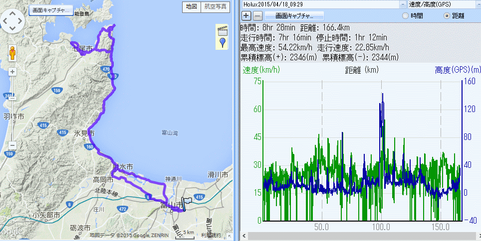 崎山半島はた坊 165km (2014.11.16) 9時40分出発、2号機canyon aeroad今年初発進、トレーニングのためホイールは岸絵里。強烈な南西の向かい風の中をもがく様に進む。北大橋から新鍛冶川コースで牧野大橋、阿尾デイリーで休憩、灘浦海岸は追い風で一気に崎山半島突端の鹿渡島へ。ここから七尾までが地獄の完全向かい風、山崎製麺での補給目指して進むも、何と営業時間が30分短縮されており既に終了。傷心で七尾駅前に向かうと黄色の安全ベスト着たどうやらブルべイベントらしい多数のローディとすれ違う。「はた坊」で昼食。店内にブルべ参加者2名、金沢発着200qと軽めのブルべの様であった。特盛の釜玉うどん780円はスンゴイ量であったが麺が抜群に美味い、これは真剣に美味いぞ。 さらに北上し、しおさいロードの能登島ロードレースに向かう際の定点撮影ポイントで折り返して帰路に。R160の峠越え後、灘浦海岸ではた坊で一緒だった2人を追い抜く。道の駅いおり近くで同じくブルべ参加者2人、県境を越え九殿浜の上りで5人を抜く。阿尾デイリーで追い付いてきた方々と少々話す。自分のバイクをキャニオンのロゴが無いのにキャニオンと見破ってくれた人が一人。好きやね〜(笑)。氷見漁港まで向かい風に耐え、ここから先は御褒美の追い風。1707の渡船こしのかたに乗船、四方から最後の試練向かい風を堪え、18時に帰宅。来週はヅラエース履いて坂練習したい。 今回もロガーのデータそのまま