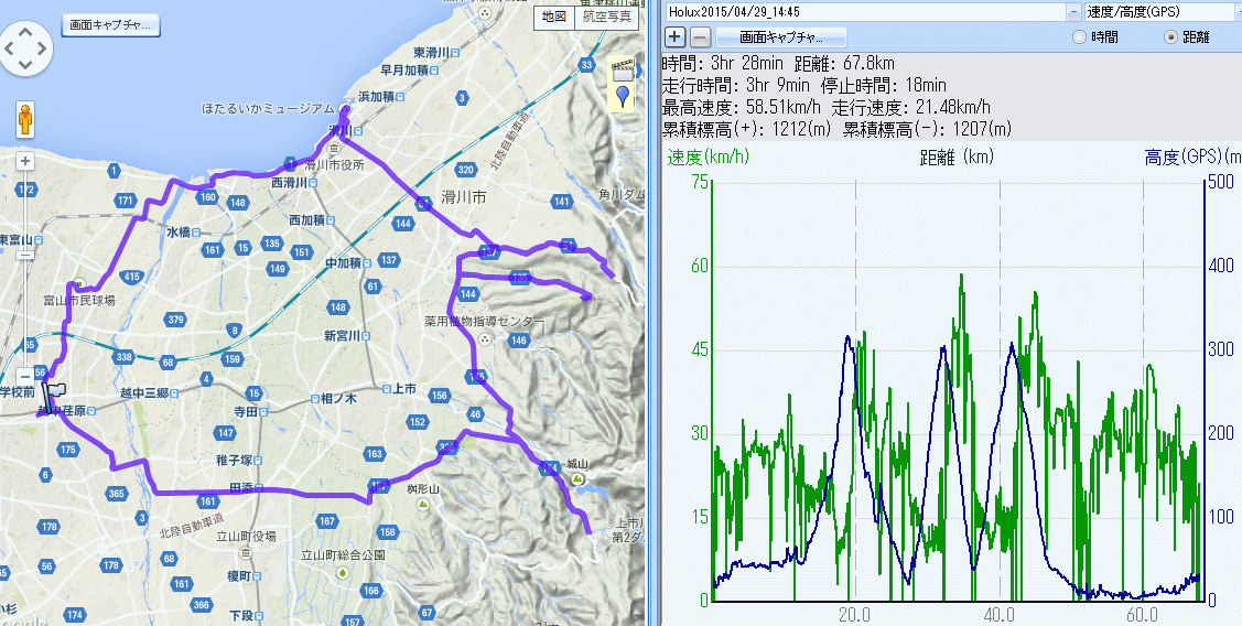 坂練 西種・東福寺野公園・大日公園 68km (2014.04.29) 本日は時間があまりなく坂トレ、多少は重いほうが練習になるのでridleyで。上市町西種に上がって下り、東福寺野公園に上がって下り、大日公園に上がって下りで、標高差270mを3回、滑川港経由で帰宅の68q。時間が無かったので距離は短めで負荷それなり。グランフォンドに向けても少し鍛えねば。 今日は今年初めての標高300mだったのに残念ながら透明度低く富山湾はぼやけて見え、立山連峰にも雲がかかっていた。それでも東福寺野からの下りは50q/h以上出てスキーの様な爽快さ。坂は上るのは苦しいけど下りは天国、やめられない(笑)。