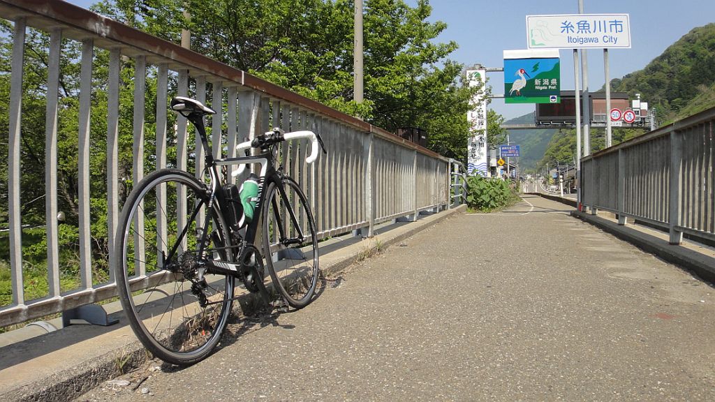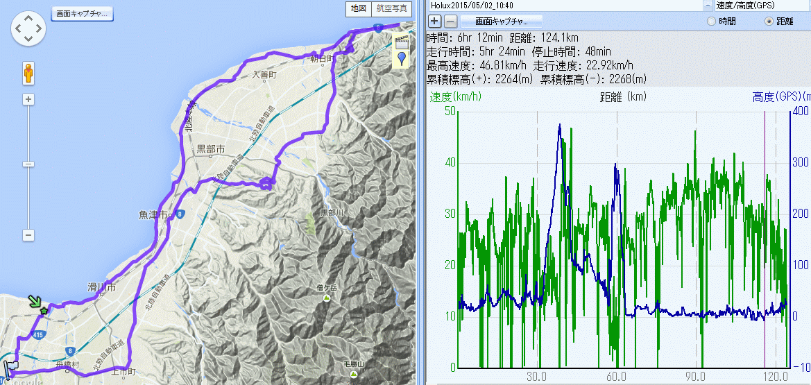 くろべ牧場 朝日町城山公園 市振 124km (2014.05.02) 寝坊が悪いのだが出掛けに夕食は18時出発とプレッシャー掛けられ、さてどうするかと。サイクル森さんのソフトクリームに触発され新川育成牧場改め「くろべ牧場」に決定。上市街道+県道3+R8で魚津、黒部市田家で補給後、牧場への坂に取り付く。今日は体調良いのか、スーパー農道から牧場まで12分で到着(参加者少な過ぎるStravaの順位では3位だ…笑)、とは言え心臓バクバク汗ビッショリ。ソフトクリーム休憩、300円と思い込んでいたら378円だった(涙)。 宇奈月に下り、スーパー農道で朝日町へ。新幹線の異次元の速さに驚愕。笹川トンネルを潜り時計と相談、S林さんが上った城山公園にアタック。正確な斜度は不明だが体感15%くらいの激坂がずっと続いて心拍数が195まで上がる。200を超えたら危険過ぎるのでバイク降りるつもりであったが何とか上り切れた。城址からは絶景、富山側は水の張られた田圃、新潟側は天険へと続く宮崎海岸、素晴らしい。 宮崎海岸に下り、とりあえず市振で新潟の地面踏んで折り返す。帰路は追い風で助かる。入善〜黒部で先行者に追い付き申し訳なくもドラフティングさせて頂き、黒部〜魚津で35q/hは出てるのにバルバの黒ジャージに追い抜かれ、ぬぬぬっ!で付いて行く。上半身がぶれているのに気付き、この人も結構無理してるなーと・・・で、魚津に入ってスパッと抜き返し、心拍180まで上げて振り切り、これが52才のやることかと(笑)。蜃気楼ロードは海岸にそれなりの人出、コンデジでの撮影では再生できないであろうレベルの浮島とバーコードの蜃気楼が出ていた。水橋まで速度キープ。アルペンスタジアムからポタリングで帰宅。 Stravaのデータ