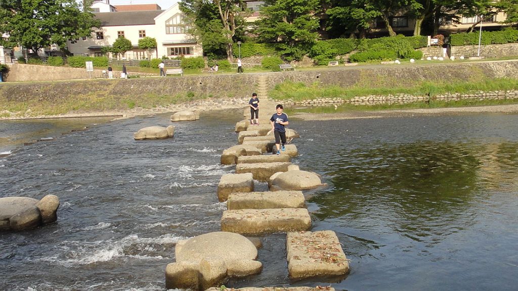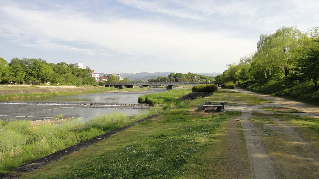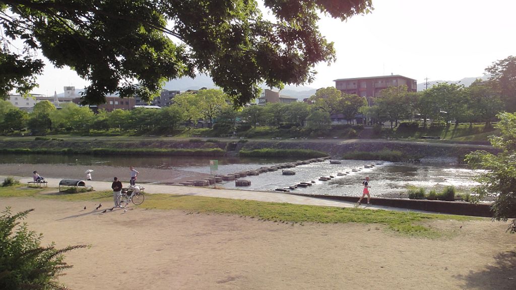 京都鴨川ウォーキングクラブ2015 2015年5月5日 またまたまたまたきっかり一年ぶりに妻子と京都の朝ジョグではなくほぼウォーク。信号の変わり目での数十メートルジョグを何回か交えただけだが、県外ジョグの記録を絶やすのがイヤで無理矢理の記録。コースは4年前の逆回り短縮版。ホテルから御苑横断し鴨川を荒神橋下の飛び石で渡り、左岸を遡る。ランナーはこれまで見たなかでやはり最多か。賀茂川と高野川の合流点を高野川だけ飛び石で渡り、出町橋の商店街で行列発見、出町ふたばなる餅屋でちまきを求めに並ぶ客だった。ついつい自分等も買い求めてしまう。1本300円とやや高価であるもなかなか美味かった。帰路は同志社女子大前から再び御苑経由。
