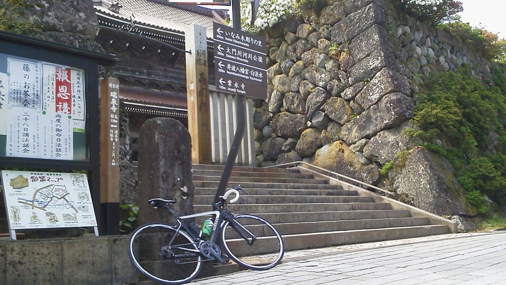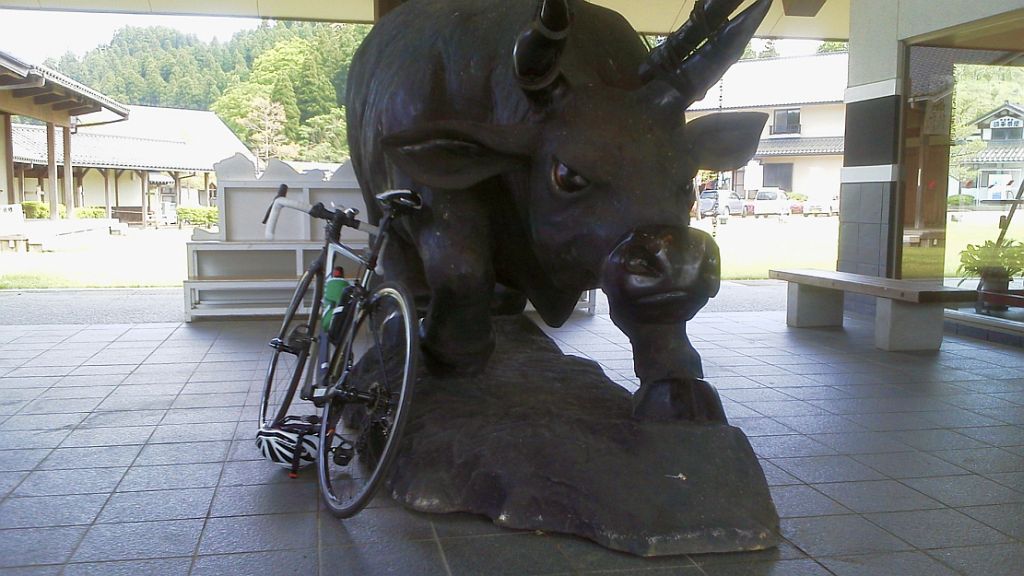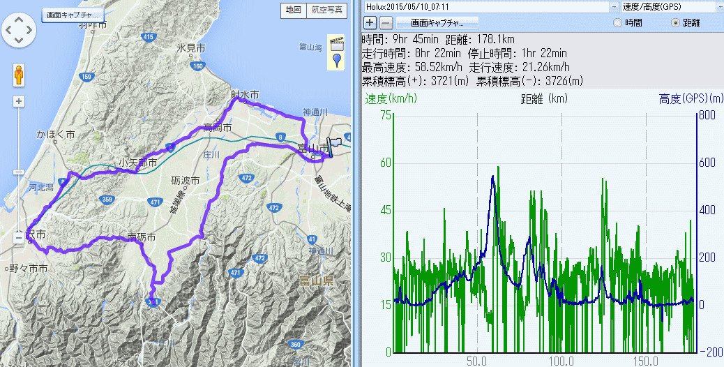 五箇山TN入口 県道27で金沢 178km (2015.05.10) GF富山の練習で2年前とほぼ同じコースへ、7時10分出発、弱い北西の向かい風、小杉から県道239+R359、安川のサークルKで最初の休憩。庄川水記念公園経由、ほぼGF富山のコースで五箇山トンネル入り口まで。激坂は約20分掛かった。折り返しの下りが寒い。城端から福光へ、なんと一福茶屋で早めの昼食休憩。県道27の三段の坂でヒルトレ。金沢大に下り、浅ノ川を渡り天徳院から兼六園金沢城。 市街を森本へ抜けるも期待した追い風どころか向かい風、西風が北風に変わってしまった。旧北陸道から津端。天田峠で黒バルバ2名を(ヒィヒィ言わない様に我慢しながら)抜き去り小矢部へ。アウトレットモールは最終工事段階? 旧道で福岡から高岡、今年初めてのまじまでソフトクリーム補給。県営渡船は時間が微妙に合わず新湊大橋をあいの風プロムナードで渡る。四方からようやく追い風。これでGF富山の練習はほぼ終了。