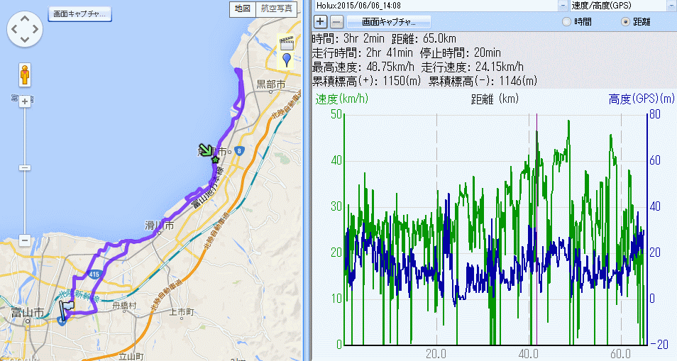 生地 65km (2015.06.06) 昨日からの雨が午前まで残り、道路が乾くのを待って出発14時過ぎ。3時間で帰宅することにして魚の駅生地まで往復。往路は常願寺川右岸で水橋から県道1、滑川でトイレ休憩。向かい風がきつかったが蜃気楼ロードを頑張って30q/hで回してみる。生地で海岸の景色を楽しんだあと、魚の駅で補給休憩、今日も須坂の果実屋さんにオレンジ1個を売ってもらえば試食用のスイカ他を頂き有り難し。帰路は追い風、蜃気楼ロード、滑川の県道1、1800m農道でそれぞれ頑張って40q/hをキープしてみる。が、心配筋肉ともダラダラしょぼしょぼと疲れていき、あとせめて12歳若かったら・・・と(笑)