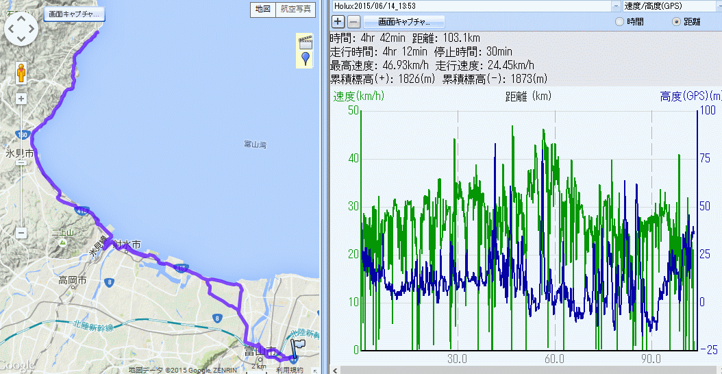 氷見七尾県境 102km (2015.06.14) 食洗器更新作業に手間取り14時出発、とりあえず100q走りたく氷見七尾県境へ。八町から商船高専に抜ける道を初めて走ってみるが止まれ標識が多く二度目は無さそう。海老江でカラスがツバメの巣を襲撃した直後の凄惨な現場に遭遇、血だらけの雛を咥えてすっくと立ったカラスの回りを親ツバメが飛び回る。雛を突き直してトドメを差すカラス…、ツバメの雛はカラスの雛の餌になるのだろうか。この光景で変なスイッチが入り、渡船には余裕で間に合うのに向かい風の中を回しまくる。渡船を降り30q/hを意識して巡航、阿尾デイリーで補給休憩。先週と同じイメージで向かい風を切り裂くつもりで県境。折り返して、追い風に乗り阿尾までほぼ全力。これで筋肉が逝ってしまった。オールアウトすれすれでヘロヘロになりながら帰宅。明日は月曜、仕事なのに体調が思いやられる。
