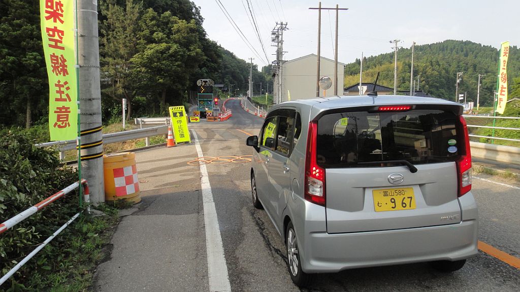 九殿浜の坂で工事の信号に掛かる
