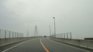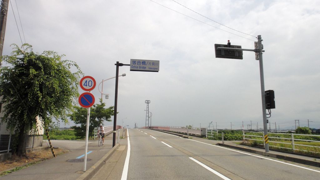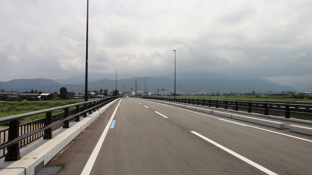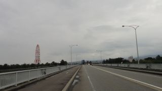 如意の渡し大橋手前、路面は完全に濡れ、減速を余儀なくされる