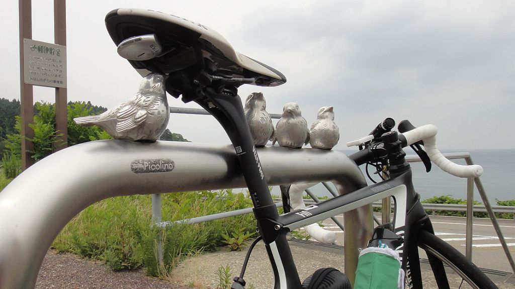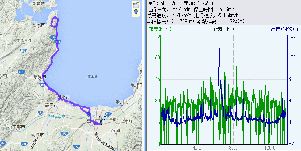 崎山半島・湯川町 135q (2015.07.04) 朝は雨、道路が乾くのを待ちながら東や山沿いは雨が残りそうで西に決定、11時頃出発。1144の渡船乗船、12時半に多古爺で昼食、九殿浜〜有磯小で氷見高校の自転車部に追い抜かれる。当初予定より時間があったのでR160を大田まで抜けず湯川に下りてみる。湯川温泉龍王閣の正体?を確認し、崎山半島を灘浦側に抜け、道の駅いおりで大休憩。阿尾までそこそこ速度を出し、氷見港から流す。伏木で1637の渡船に間に合う気がして全力走、ギリギリで乗せてもらう。1730帰宅。