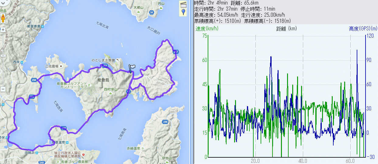 1年ぶりの能登島+七尾西湾周回 65km (2015.07.05) 一年前と同じく能登島+七尾西湾周回、能登島ロードレース出場の妻子送迎ドライバー。ガラス美術館前の道の駅に駐車し、8時半スタート。ハーフマラソンコースを1周し、北湾沿いを西進、閨のフィッシングパークで補給休憩。ツインブリッジから七尾西湾を左回りに、中島、田鶴浜、和倉温泉。能登島大橋今年は車道で渡った。昨日135q走っていたので二日間で200q、疲労は去年より大。