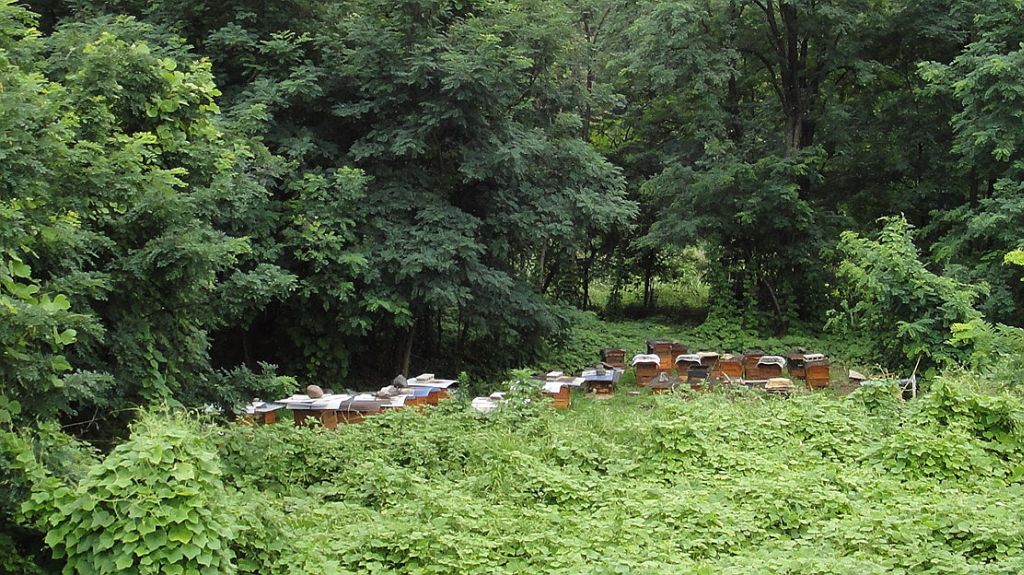 養蜂の箱がずらり、ミツバチがぶんぶん飛び回っていた