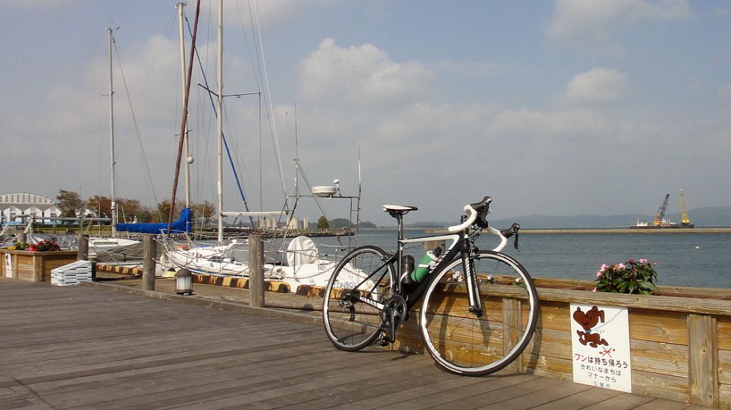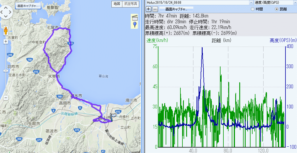荒山峠七尾呉羽山城山 143km (2015.10.24) 朝8時出発、二週間ぶりのロードバイク、aeroadは三週間ぶり。ウェアはこの秋はじめて2枚重ね、上はモンベル下はCW-X。午後は冬型の気圧配置で雨の予報、帰路の西風選択で西へ。渡船時刻にシンクロせず、新湊大橋はあいの風プロムナードで渡る。氷見から未踏の県境ハンティング?で、K18から荒山峠。指崎で自動販売機休憩、モンベルの長袖を脱いて背中に仕舞い、GBの半袖だけにする。初めは5%程度の軽い坂だったが、氷見牛の牛舎が並ぶあたりから一気に斜度が増し、峠までのラスト2kmは推定ほぼ10%時々15%近く、強い向かい風もあって、ダンシングしながらもう嫌だなーと脚を止めそうになったところで何とか県境、想定以上にハードだった。 中能登町へ一気に下り追い風に押されて七尾へ。11時半前で昼飯にはまだ早く大田の711でコーヒー休憩後そのままR160で氷見へ。灘浦海岸は強い向かい風でまったく進まず必死に回すも、荒山峠のおかげで有磯の坂も九殿浜の坂もかわいく思えてアウターで一気。今日は県境でも阿尾でも休憩せず、多古爺でラーメン小の昼食。島尾からは追い風で快適、海王丸パークで警備に止められるも歩道で行くと言い訳して帰路もあいの風プロムナード。富山に戻り、まだ天候が持ちそうなので御廟口から呉羽山への20%の激坂〜、ついでに城山に行くも吉作の坂で身体がきしむ。 富山市街は天皇皇后来県で警官だらけ。日の丸持った不思議な群衆眺めつつ帰宅。皇室の仕事から無駄に公務員の仕事増やす平時の田舎回りは削除して良い気がする。今日はフォームをちょっと変えてみたらお尻があまり痛まず。fizikのサドルは難しい(笑)。